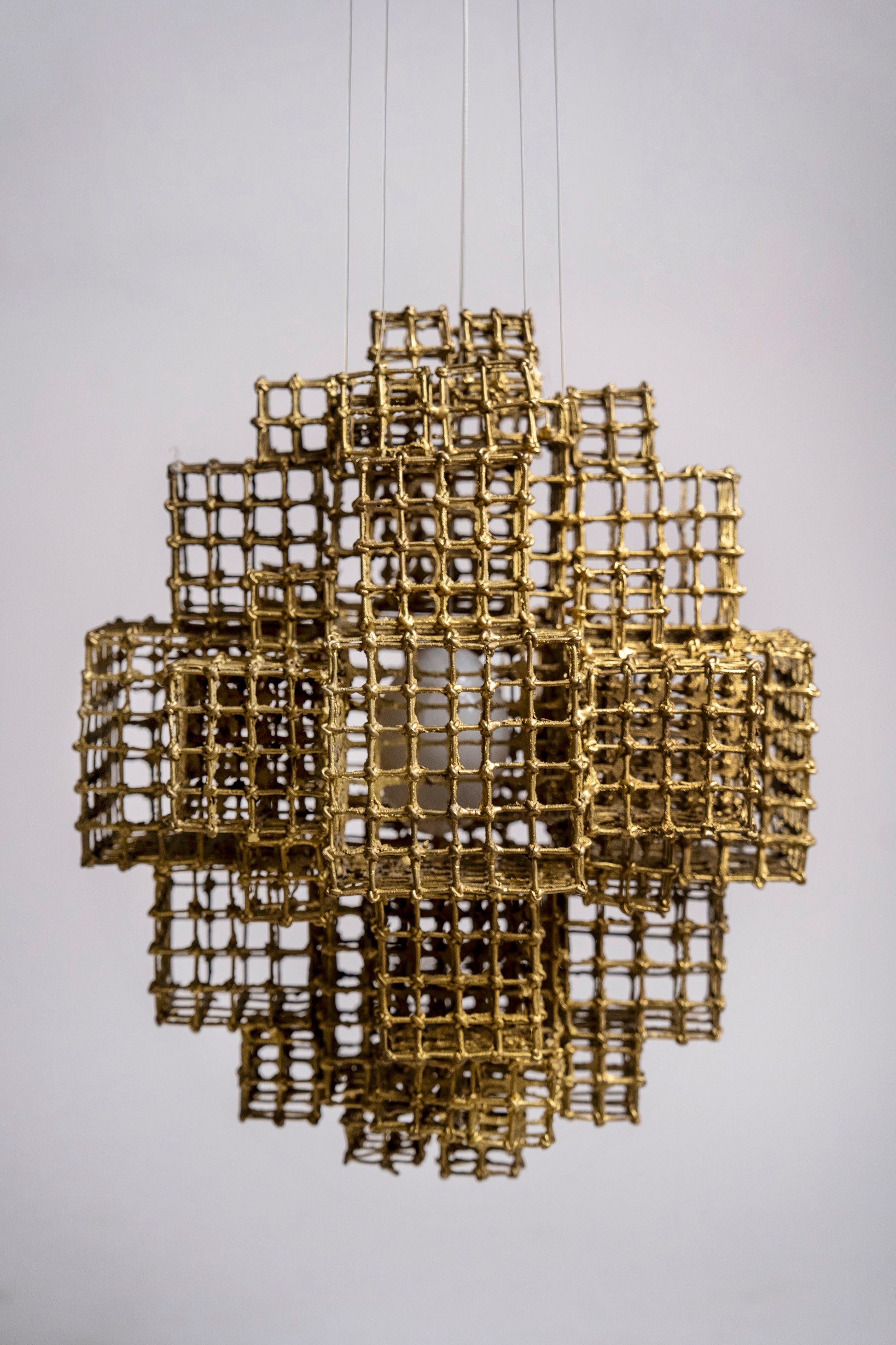 Drawing from the concept of the cosmic egg, it levitates effortlessly, suspended by strings with no visible rod. This celestial design merges the craft of Dhokra with a sense of weightlessness, creating a captivating piece.