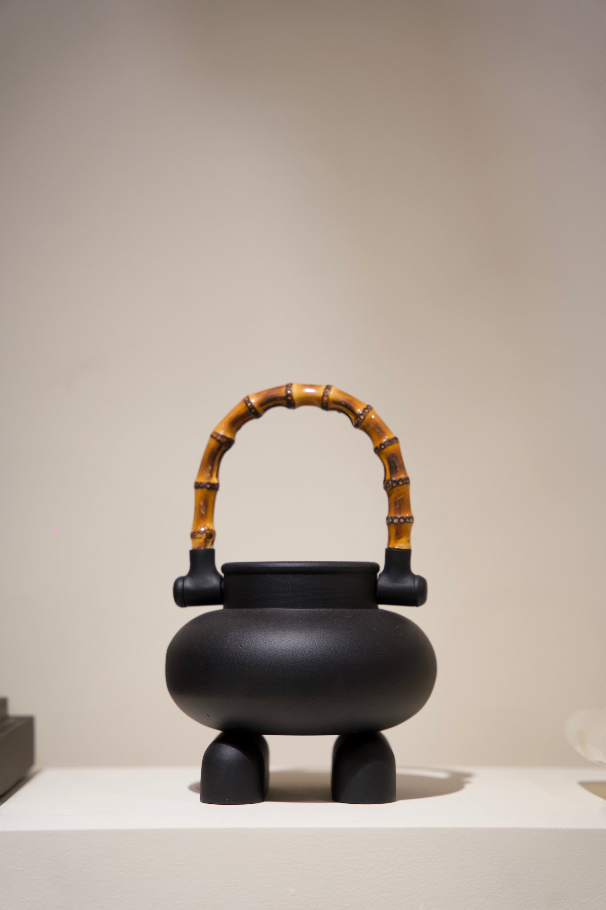 Two bulbous forms nest into one another — balanced, elemental, and deliberate. Crafted in deep matte black and accented with a curved bamboo handle, Bamboo Balti is both vessel and sculpture, echoing the Indian balti while stripping it down to its most graceful geometry. The addition of a hand-lathed pull and brass detailing adds a ceremonial touch — elevating the everyday into the almost mythic. A modern ode to tradition, with quiet power and poetic presence.