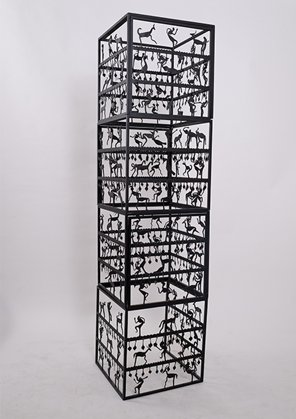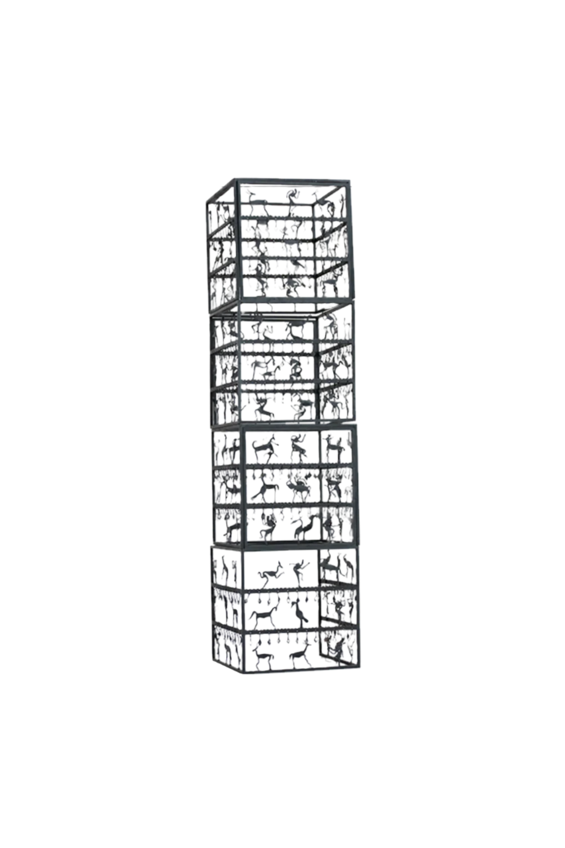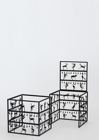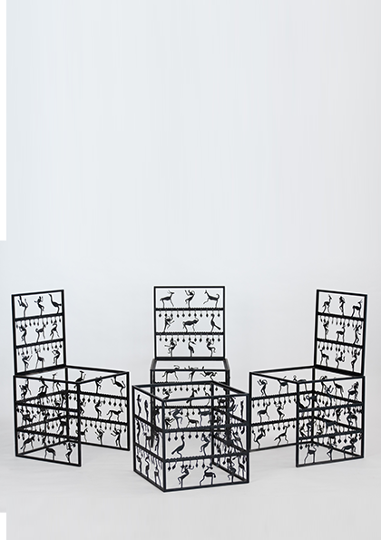 An assemblage of four chairs and a table, fit into one another to create a stackable totem of six feet in a black wrought iron. Celebrating an ancient traditional technique of miniature silhouette cut-outs, representative of livelihood, each piece is a playful narrative that completes itself through the running length.