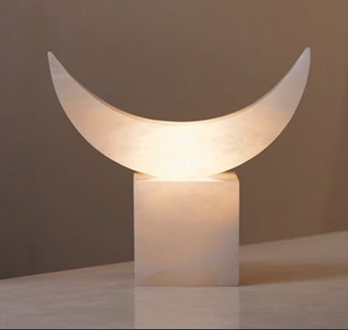 A carefully sculpted crescent form is mounted upon a rectilinear base in alabaster emanating a warm glow from within. This sculpture with its curved profi le heroes the material through its simple form and impeccable detail, illuminating the natural stone from within showcasing exemplary craftsmanship with a contemporary flair.