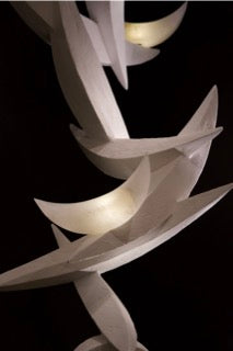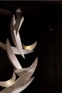 Chaand Guccha brings together constellations of crescent forms cast in aluminum, arranged in a cascading composition reminiscent of moon fragments suspended mid-orbit. Each textured element captures light and shadow in shifting ways, turning the installation into a luminous sculptural gesture. Evocative of celestial movement, the piece transforms its surroundings into a meditative nocturnal landscape.
