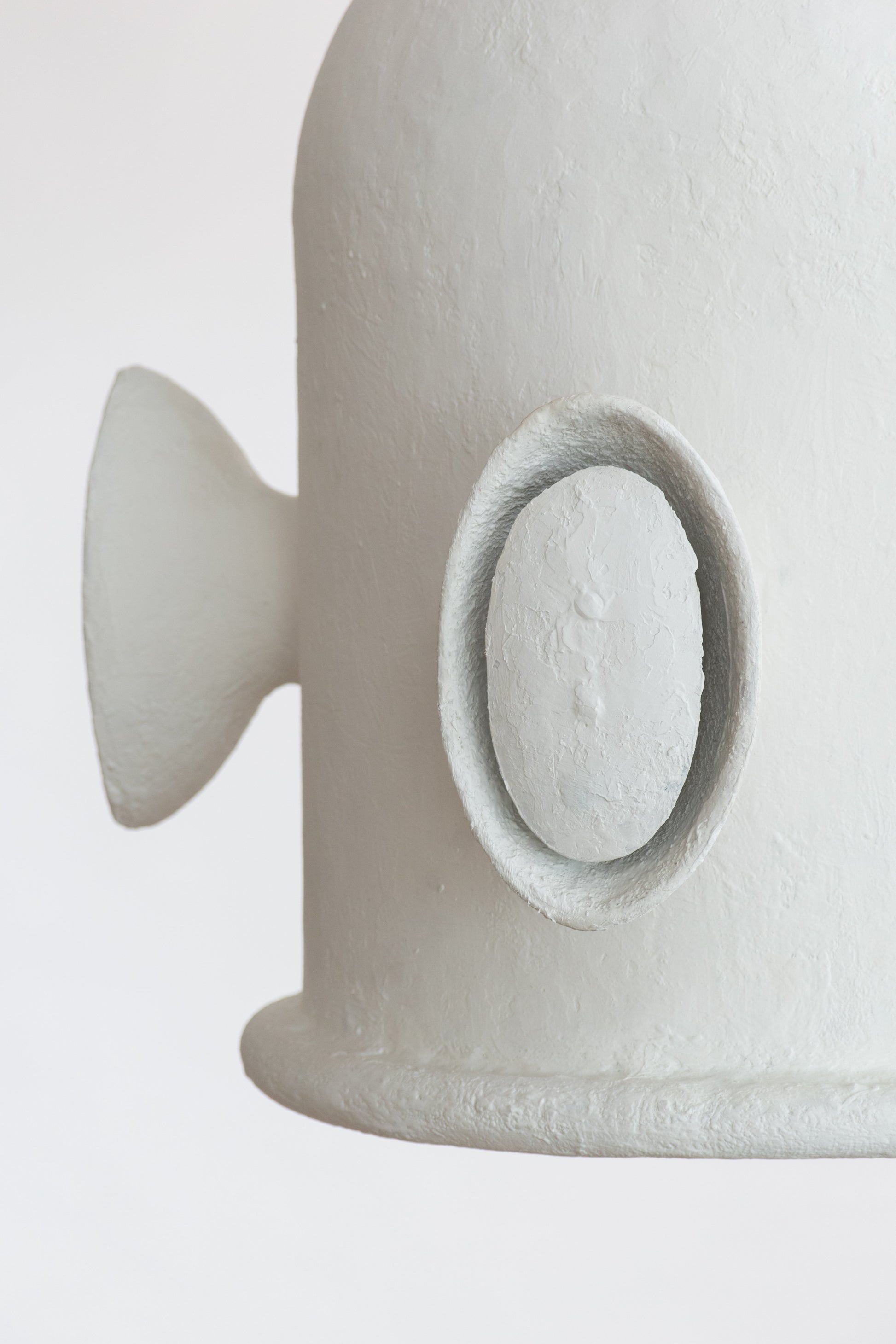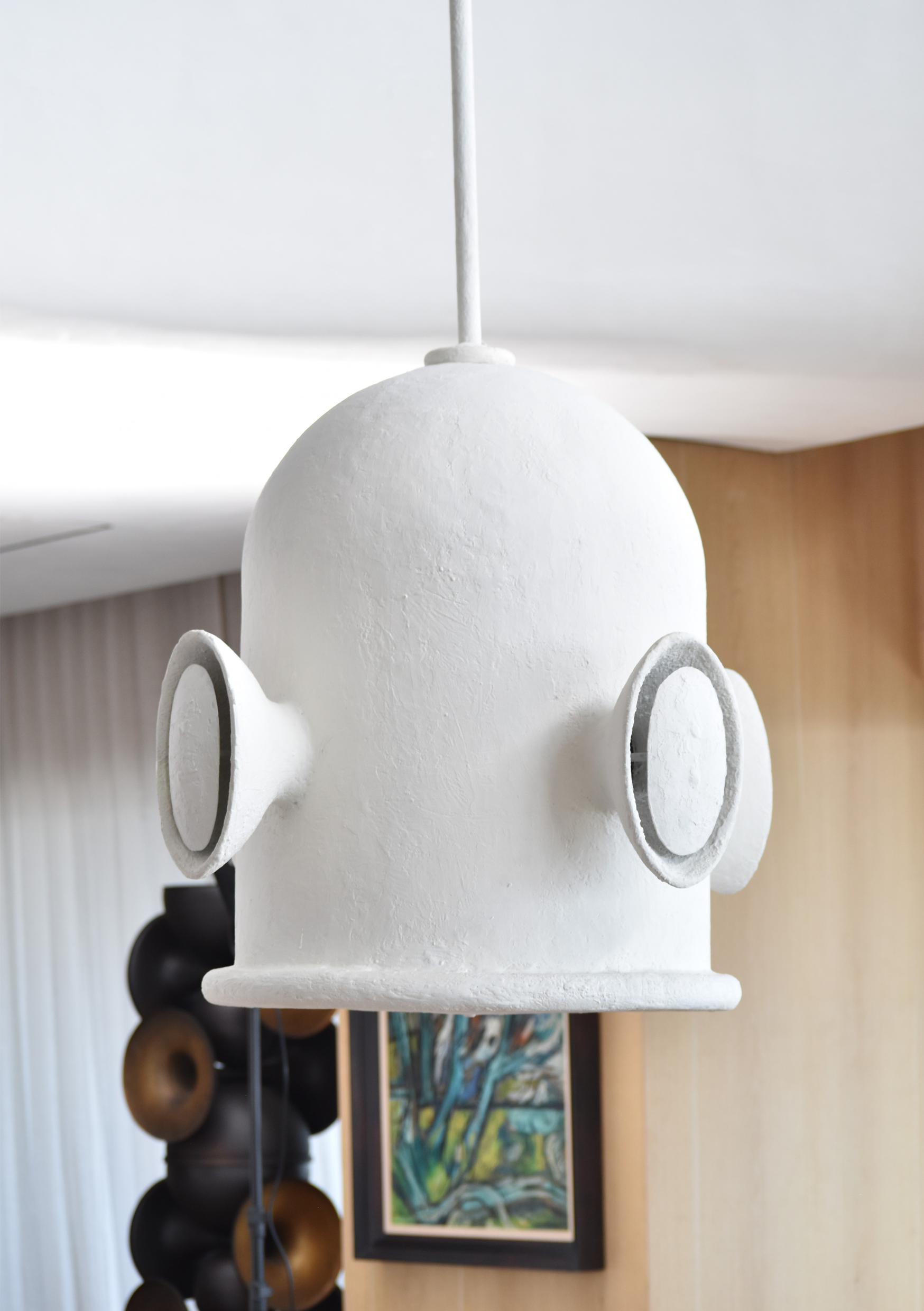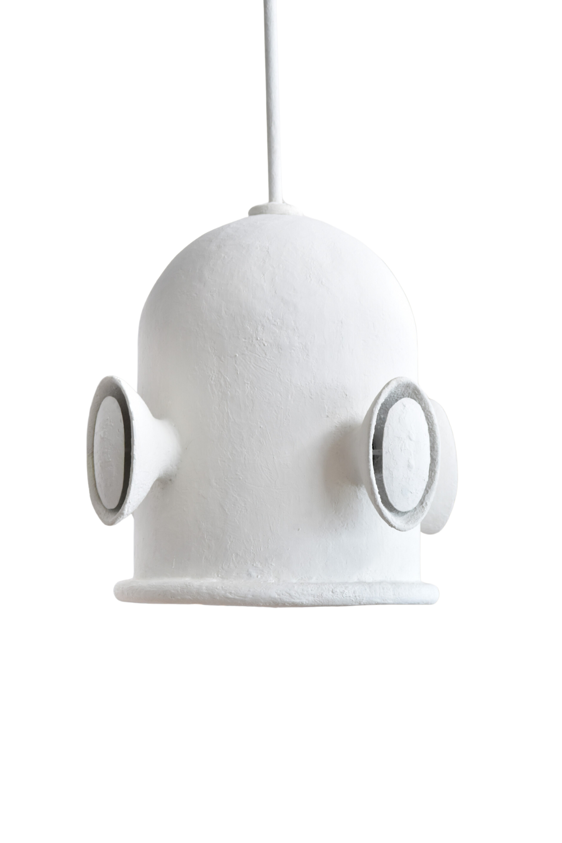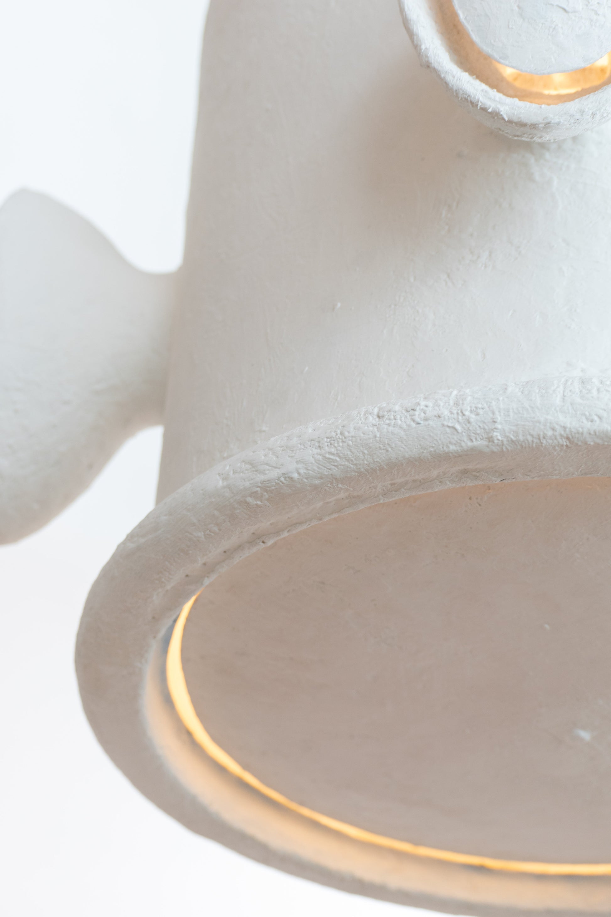 Modern lines meet ancient Indian geometry to create a structure that is both a piece of sculpture and a functional light fixture. Handcrafted to perfection, a singular cosmic egg is suspended mid-air, with a warm ring of light emanating through. Cast in Aluminium with a raw plastered finish, four bulbous members emerge from its parent form, appearing as protruding ’kaan,’ these bulging elliptical ends illuminate their surroundings - glorifying it much like its name.