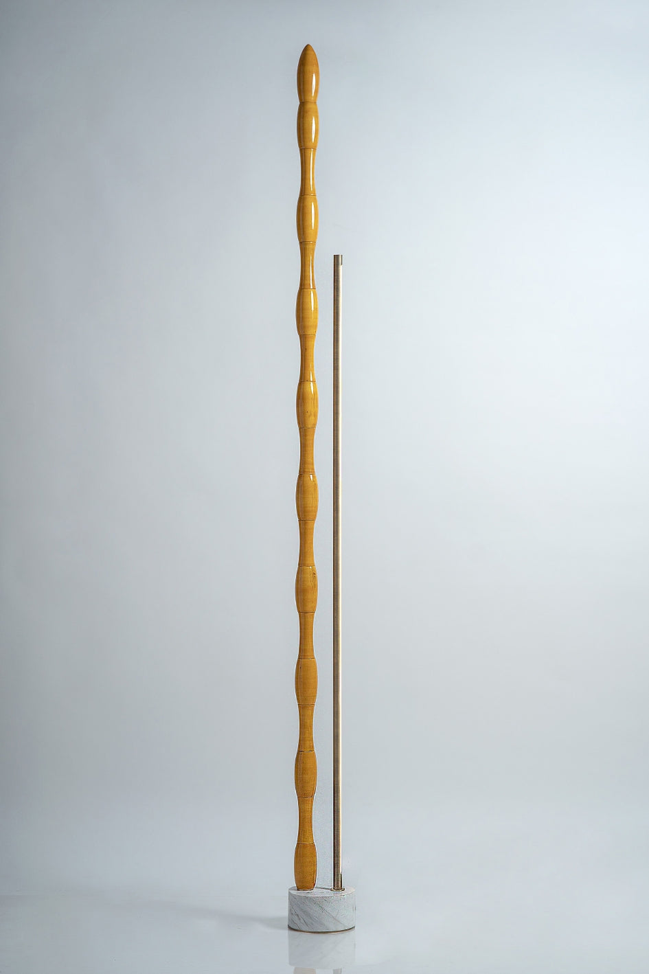 ‘Channapatna’, the evolved toy craft, finds character through an assemblage of carefully crafted, naturally lacquered beads as a functional light fitting mounted upon a white marble base. This six feet tall running-length lamp with yellow convex and concave beads placed alternatively functions as a floor-standing lamp with a bronze casing protruding out emanating a warm glow – truly an embodiment of luxury!