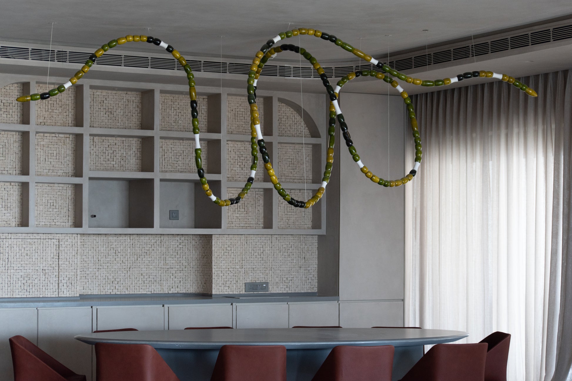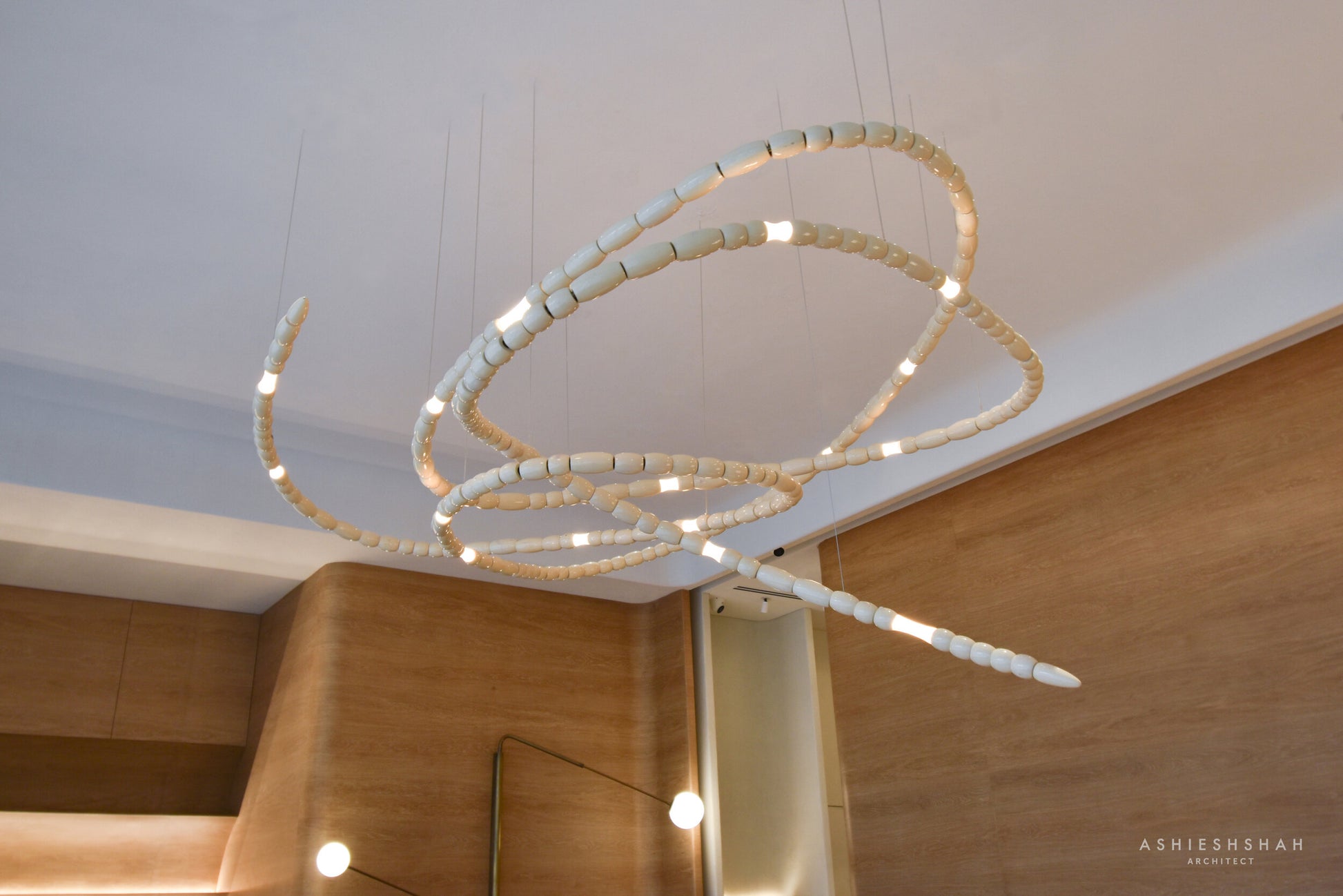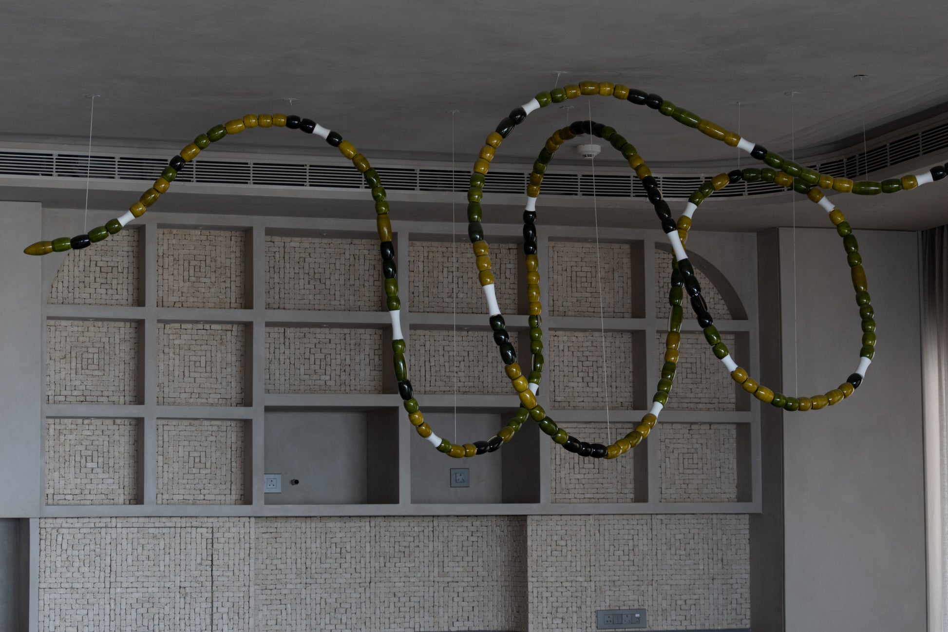 The Channapatna light,’ a take on the indigenious toy-craft of Karnataka is a functional light fi tting which is made in collaboration with Noor Salma, a master craftswoman - The naturally lacquered beads follow the curvatures profi le along the object’s bends. Light shines through the contrasting concave beads that position themselves intermediately.