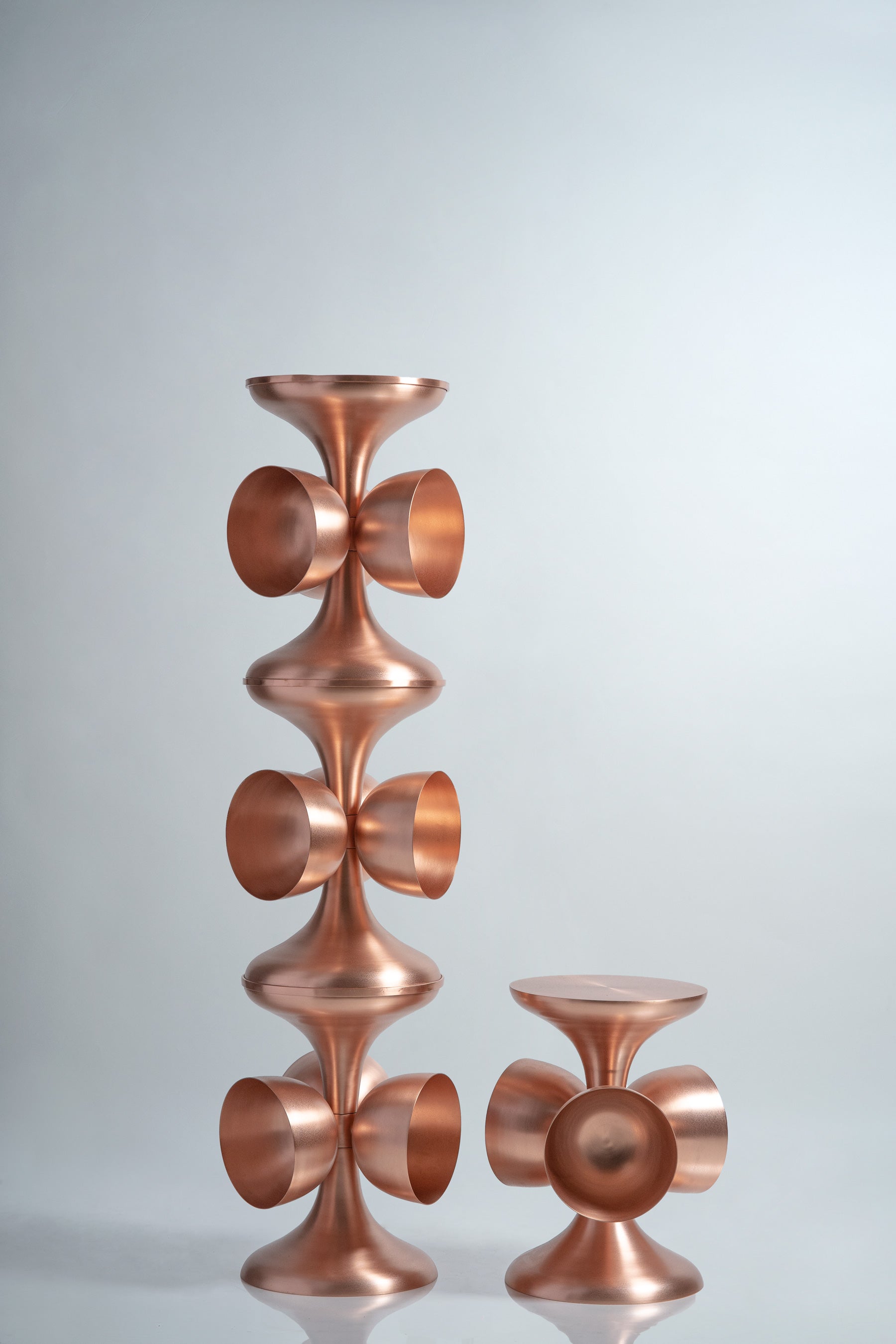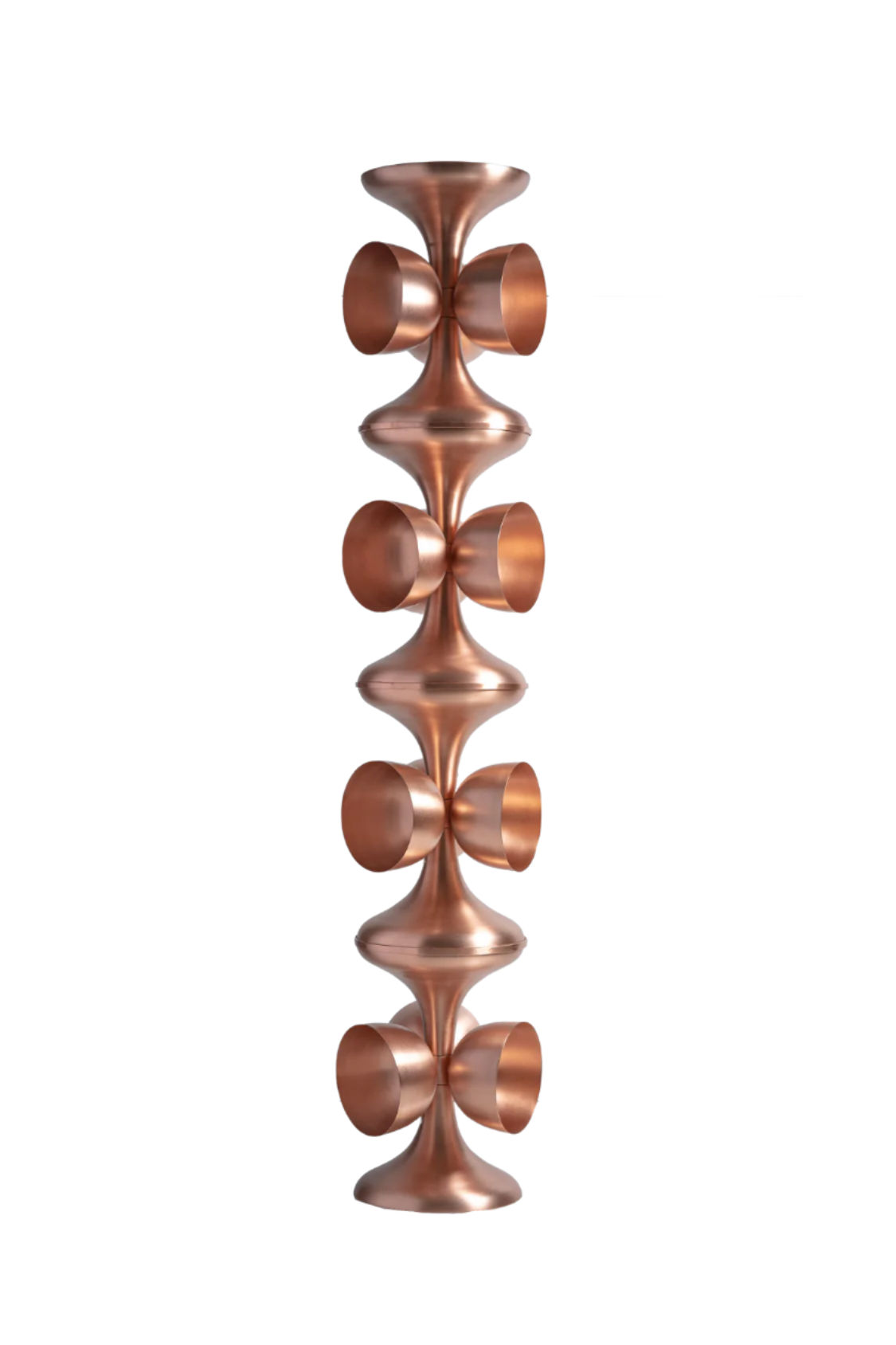 An abstraction of Shah’s ‘Kantilo Console,’ the ‘Damroo pillar,’ is a set of four perch stools in copper, bulbous at the edges and lean in the center, appearing as protruding ’kaan,’ placed perpendicular to its predecessor but in an entirely new avatar. The geometric forms that previously found themselves placed inversely over the other find an addition to make them three in number, the three eyes of Lord Shiva.