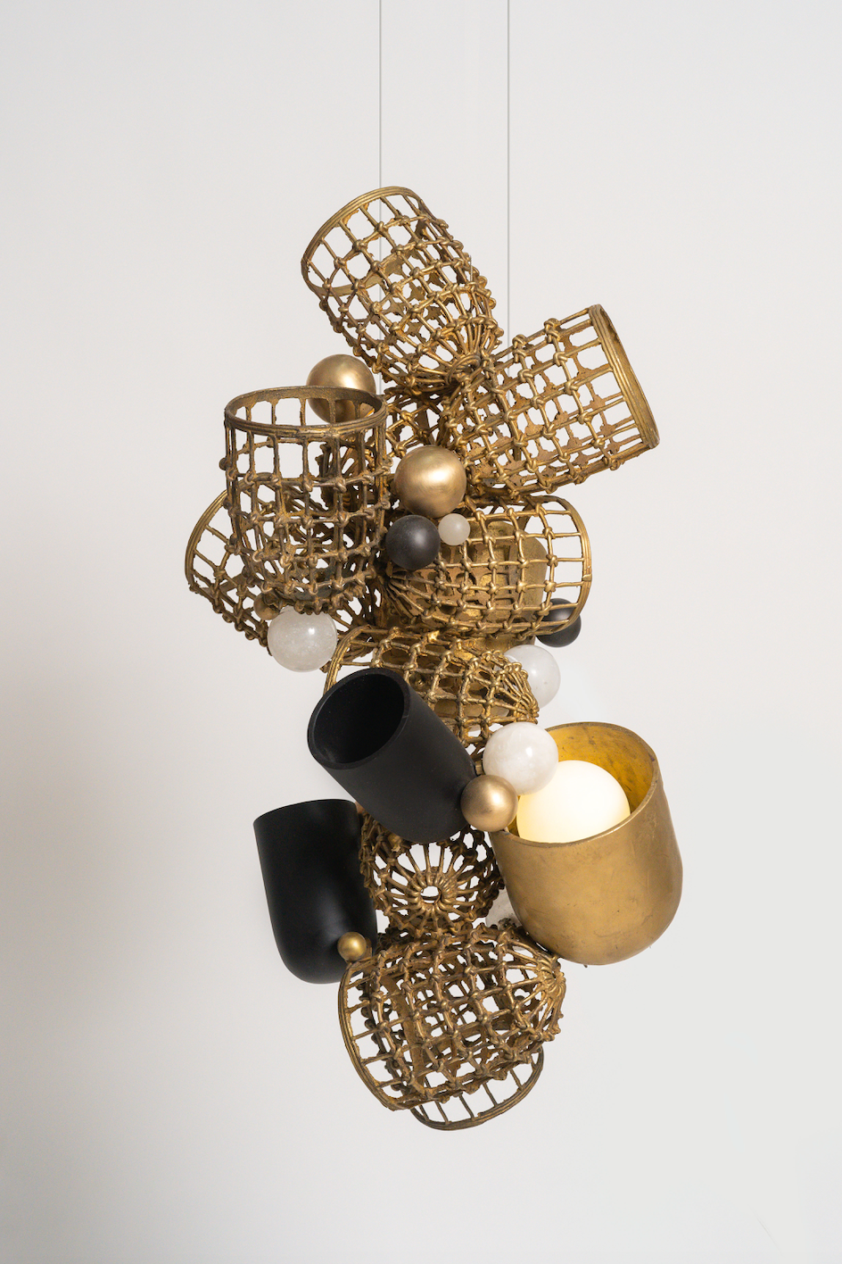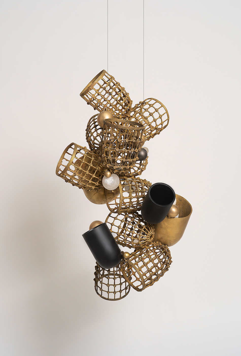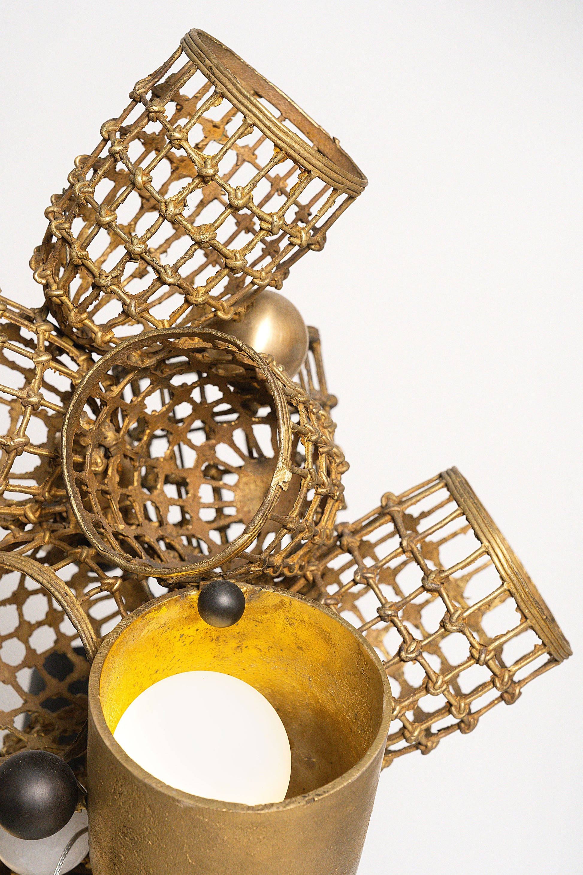 This suspended light, crafted through the intricate lost-wax process of Dhokra, celebrates the beauty and skill of rural craftsmanship. Unlike mass-produced city-made pieces, the delicate details of this light can only be achieved by hand, reflecting a technique that machines cannot replicate. Juxtaposed with a cast-brass cup that holds the light, the piece contrasts the fine, organic shapes of the village craft with the precision of urban metalwork. Enhanced with alabaster and brass spheres, it evokes the imagery of berries on a tree—like a branch suspended in midair, resembling an aerial plant or a bouquet of flowers.