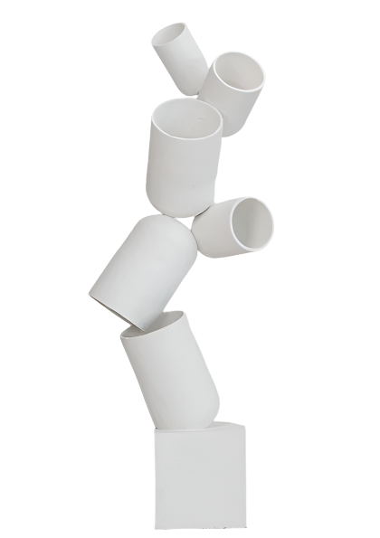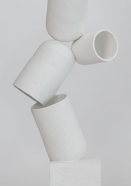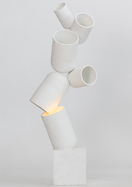 Handcrafted to perfection, the Guccha totem features angled cosmic eggs, intersecting with one another mounted on a rectilinear base while emanating a warm yellow glow. Alternatively purposed as a series of vases and crafted in cast aluminium with its raw plastered finish, this functional sculpture in white infuses a soft light into its interior environment serving as an embodiment of Shah’s wabi-sabi philosophy.