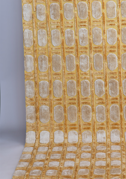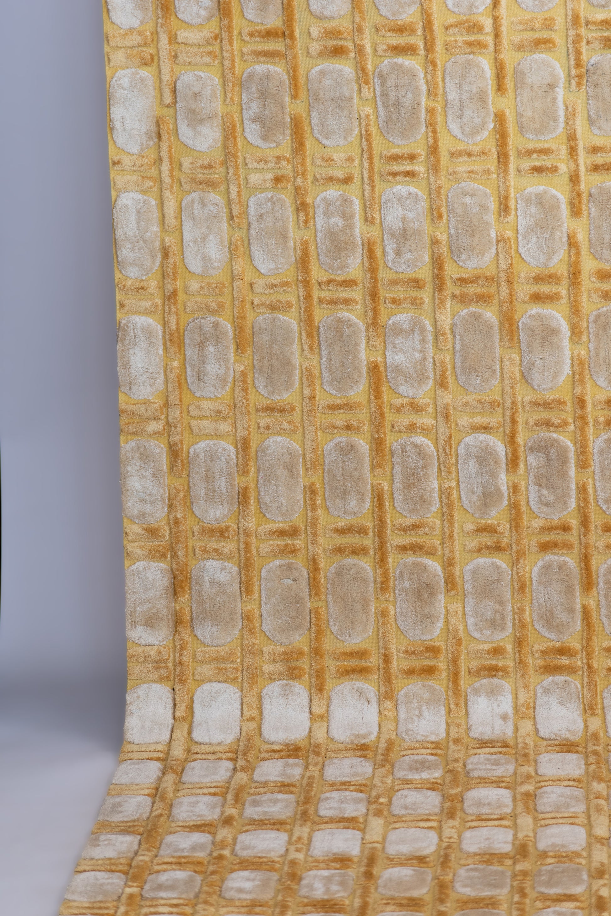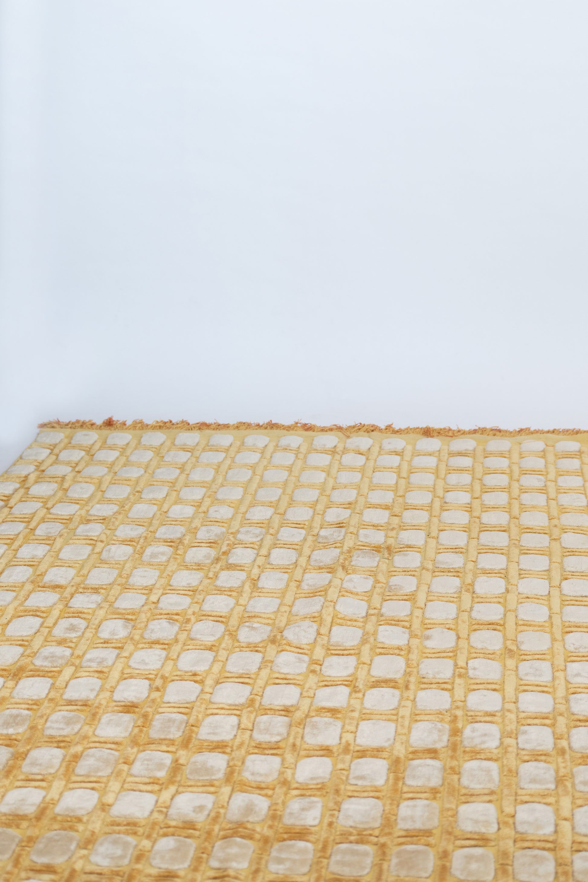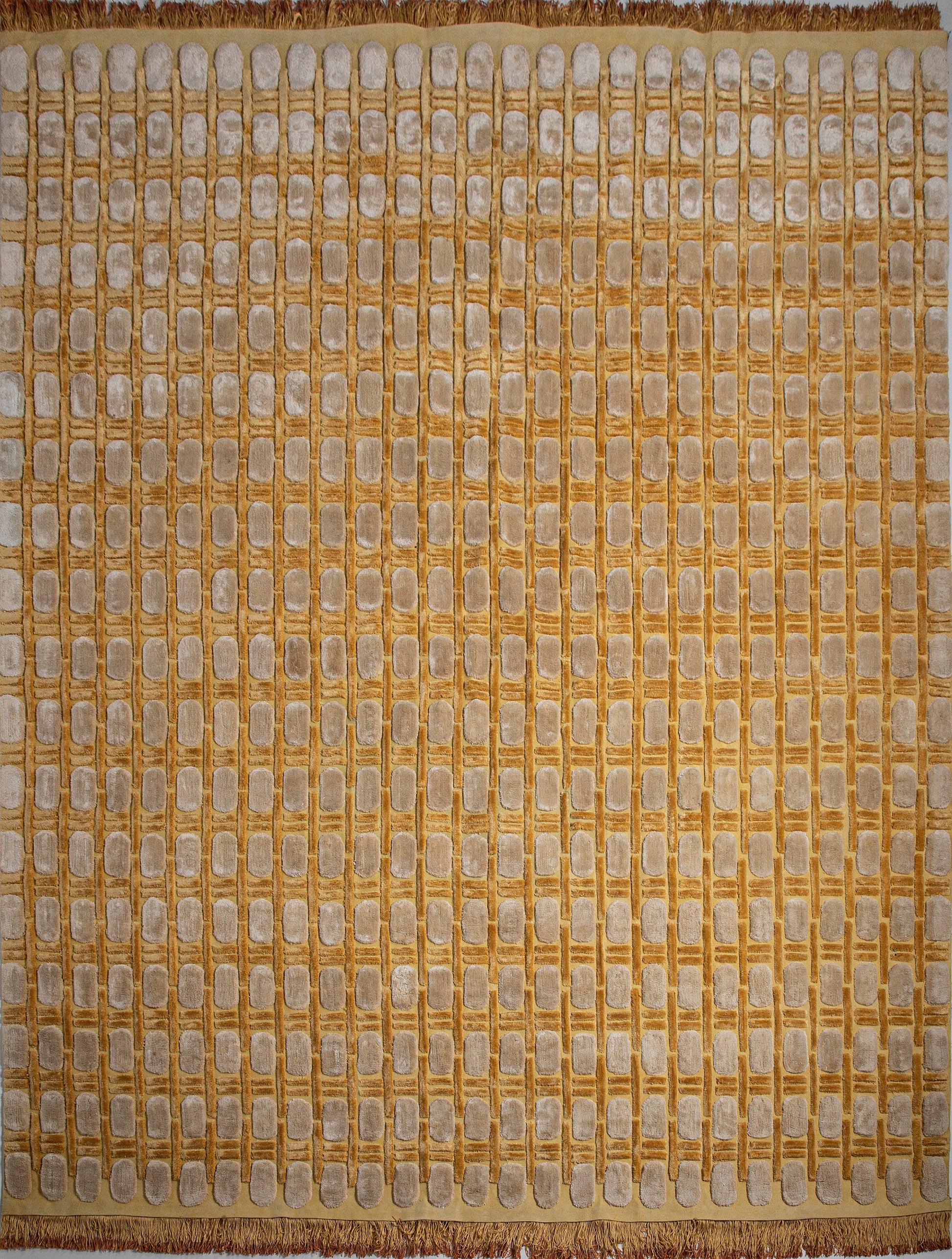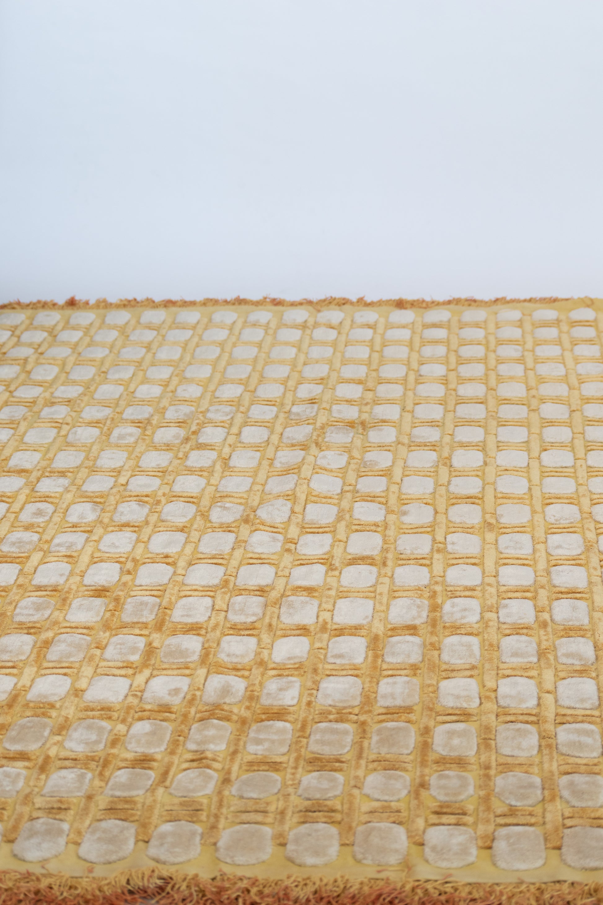 A series of water-coloured paintings by Shah find voice through this hand-tufted rug with its turmeric-hued undertones and overlaid cut in monochrome. Each rug has been simplified to two-dimensional basic shapes with three-dimensional character - tufted with colour and layered with texture, the spread, woven with architecture. The Haldi rg is handcrafted to perfection from a soft blend of silk and wool - their lines and geometric shapes form a motif that's striking in its simplicity.