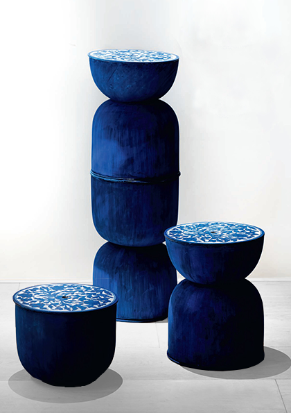 A marriage of primordial Indian handicrafts with a modern day aesthetic, The Jaipur Blue Stools pay homage to an intricate art form, modernized with ethnicity. Four reversible stools, painted on either side with traditional motifs, sit over each other to form a six foot totem pole that’s enveloped in a hand brushed blue.