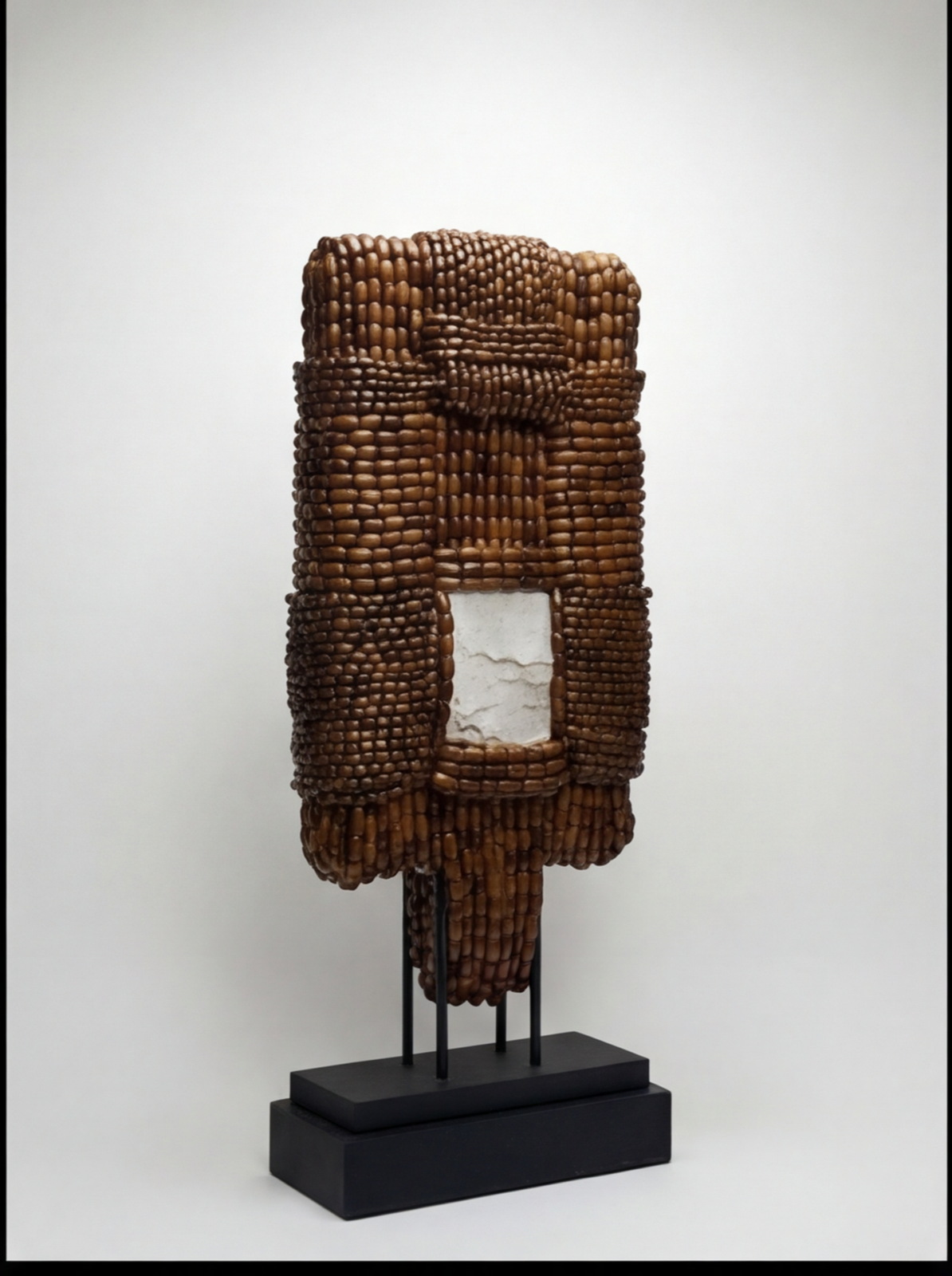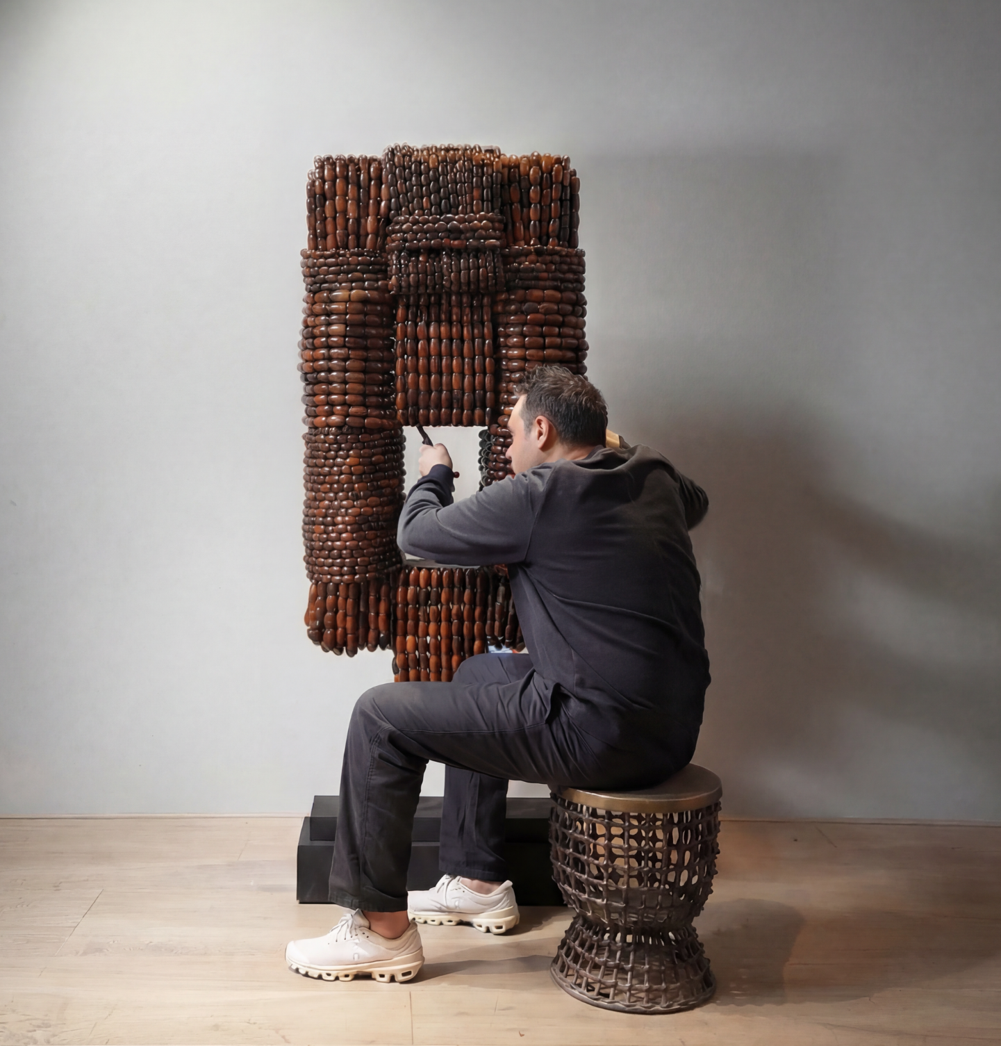Japp Screen marks the first 3-dimensional exploration of Channapatna craft. The surface wraps entirely around the form, moving beyond its traditionally flat expression. Rendered in deep brown tones, the piece recalls prayer beads and meditative counts, while its woven surface draws from Japanese bundling and African braiding. A parchment-lined core emits a soft internal light, giving the object a contemplative presence. Japp Screen exists between sculpture and textile—ordered, immersive, and meditative.