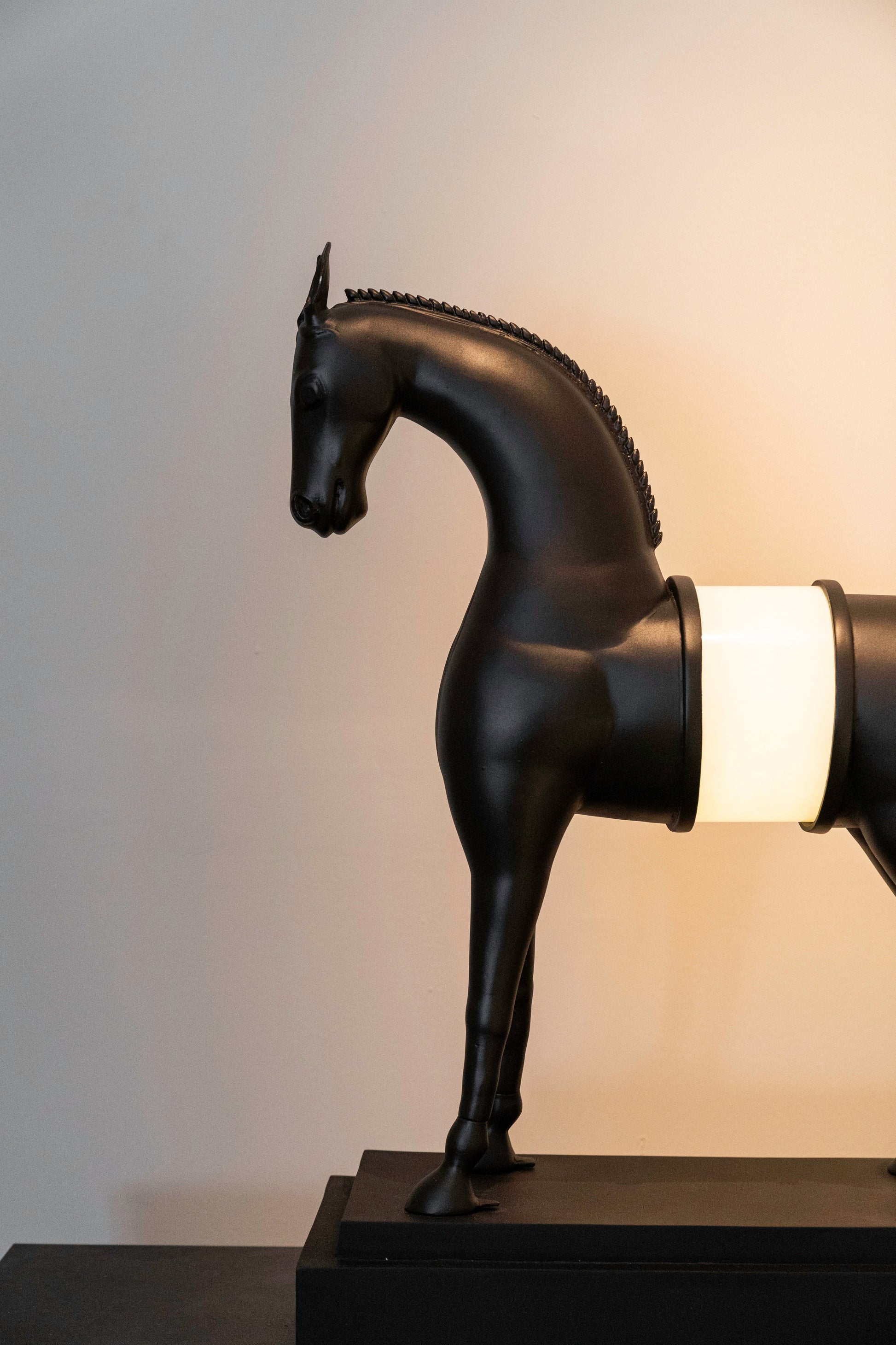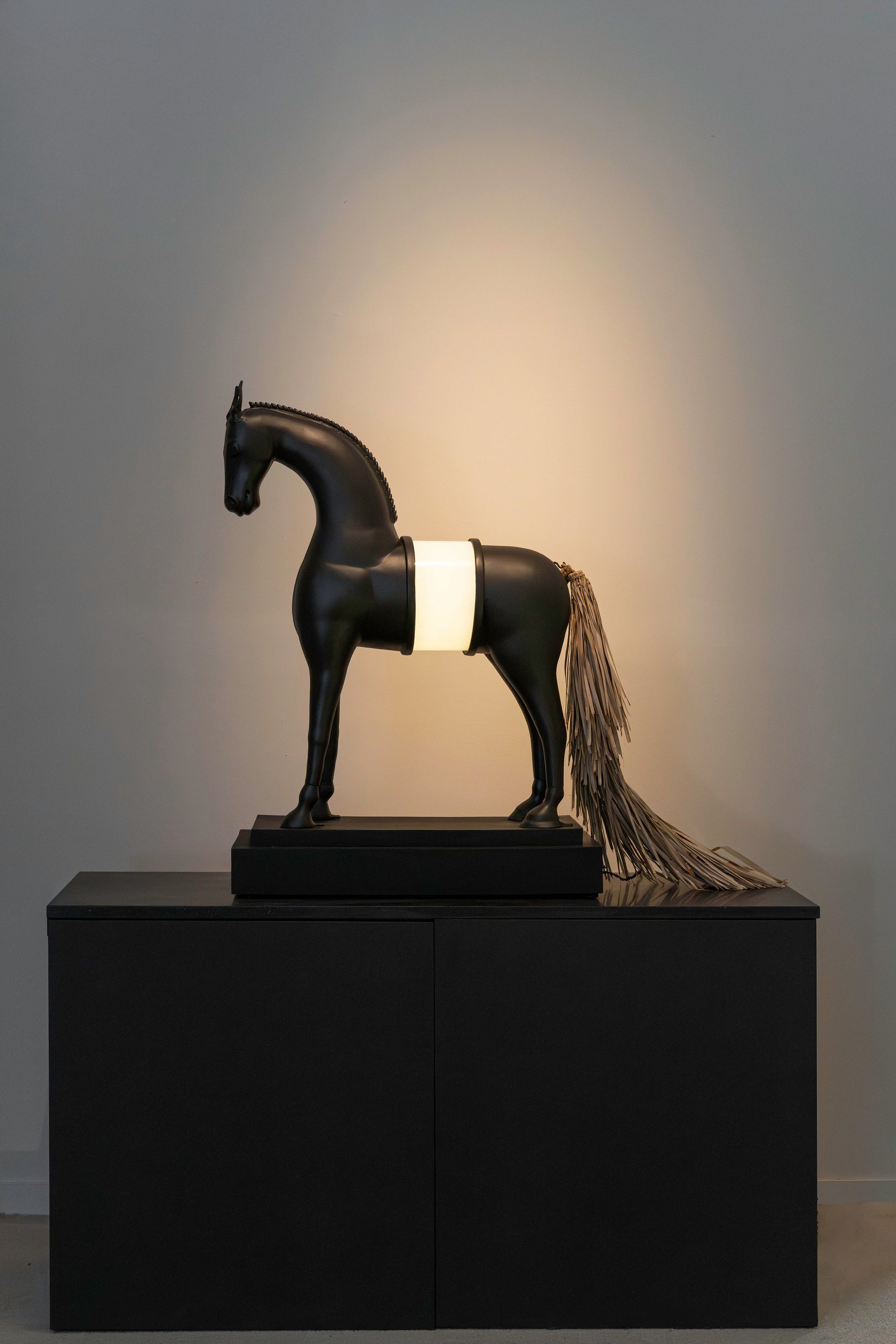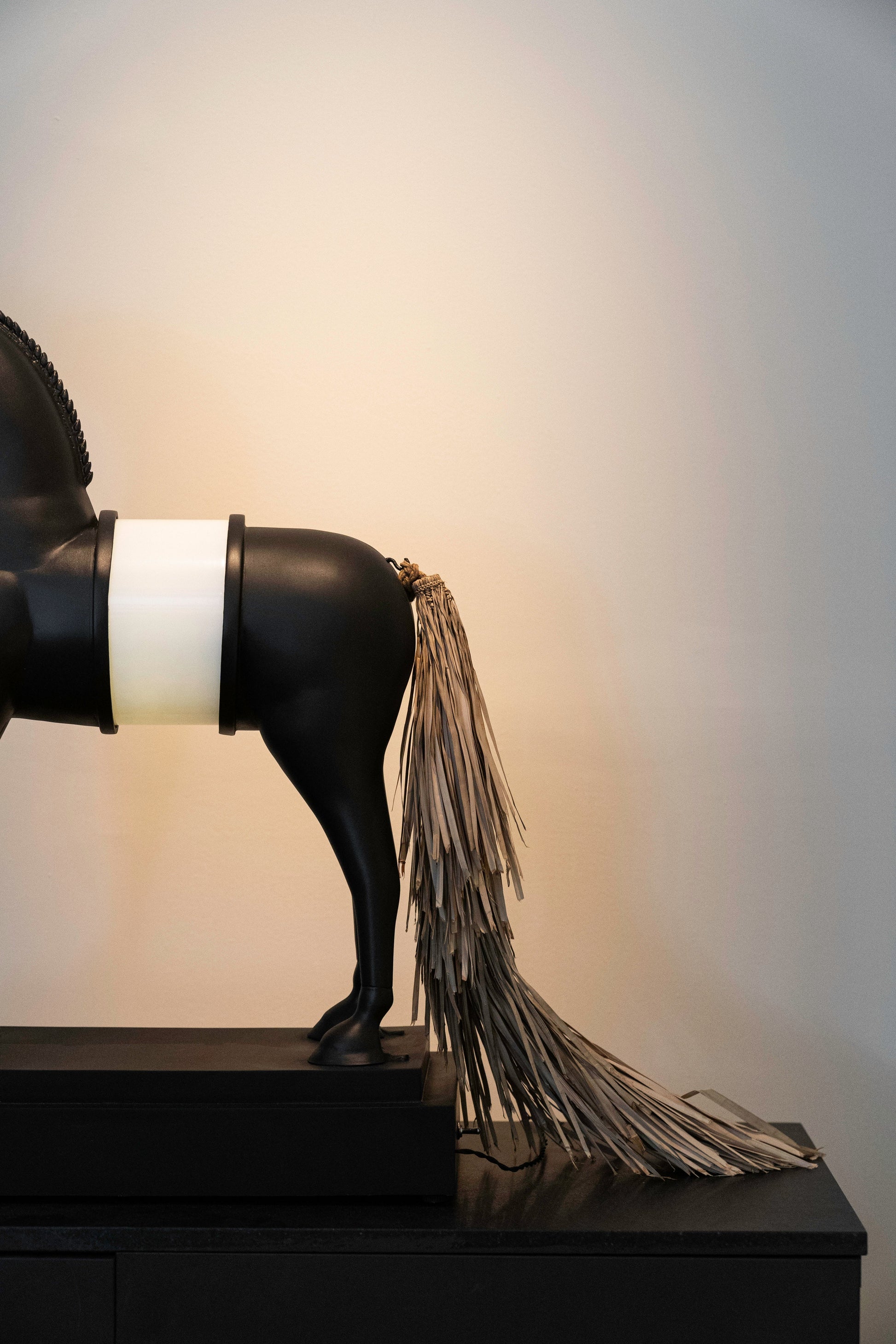 The Kala Ghoda, crafted from cast aluminum, is a bold fusion of strength and elegance. A sleek glass element splits the design, capturing light for an ethereal effect, while a Naga-woven tail adds rich texture and contrast. This sculptural piece seamlessly blends tradition with modernity, making it a striking focal point in any space.