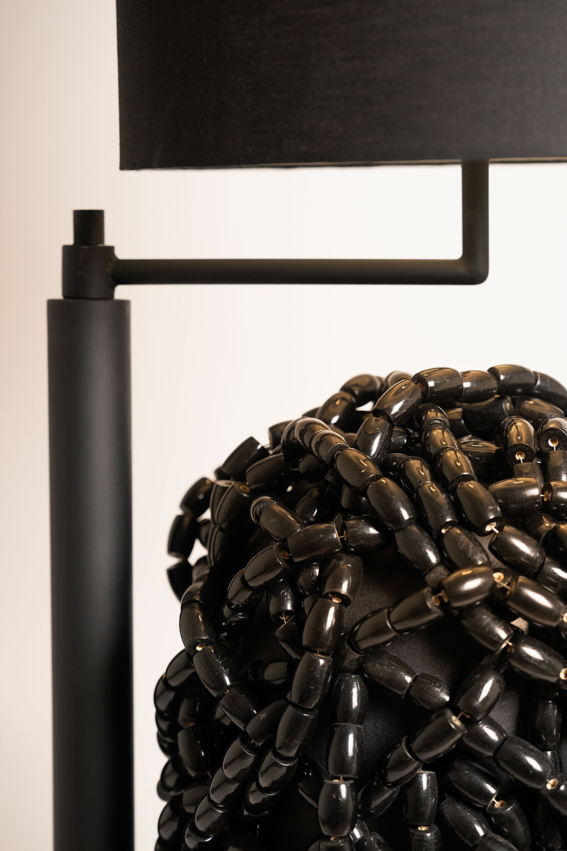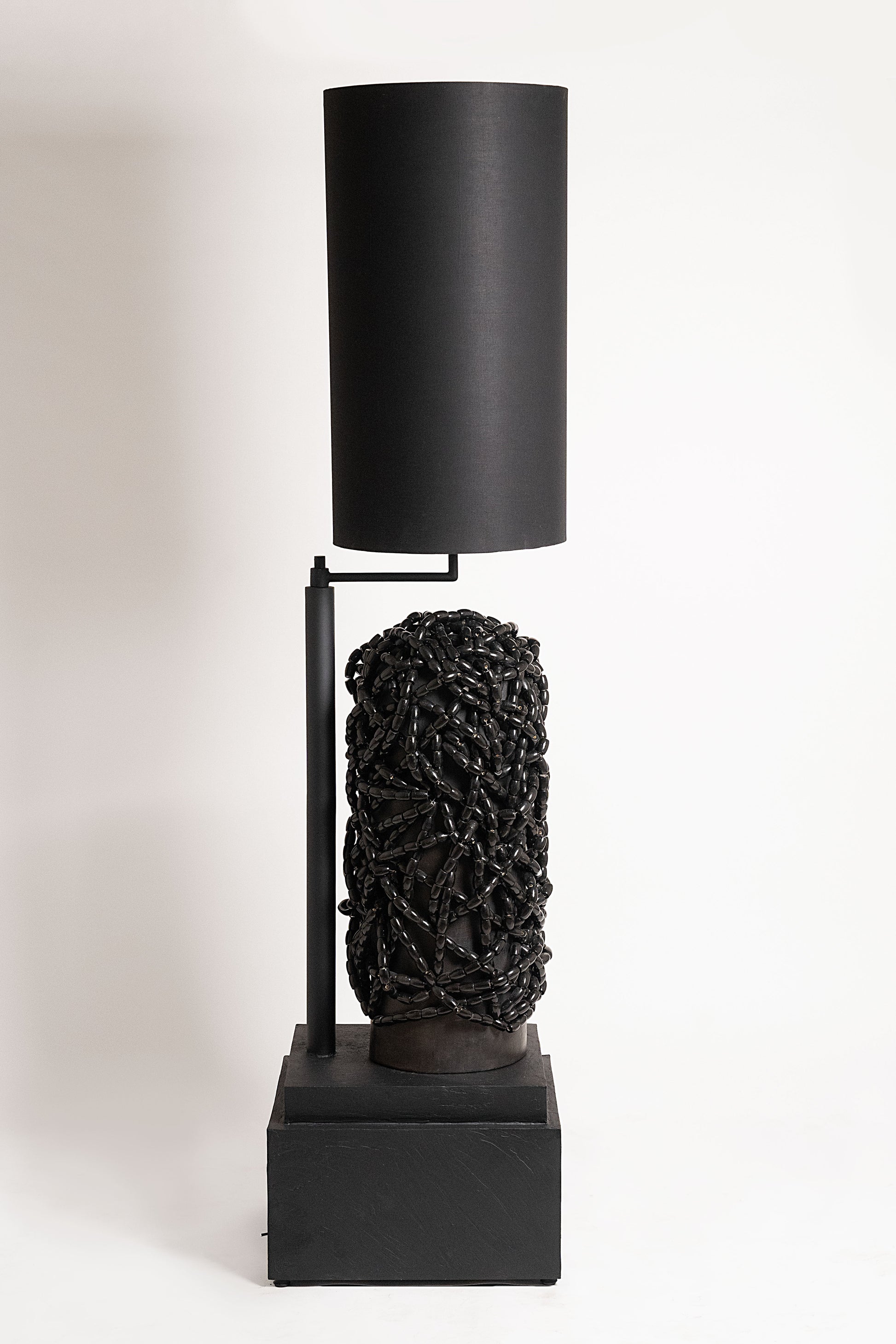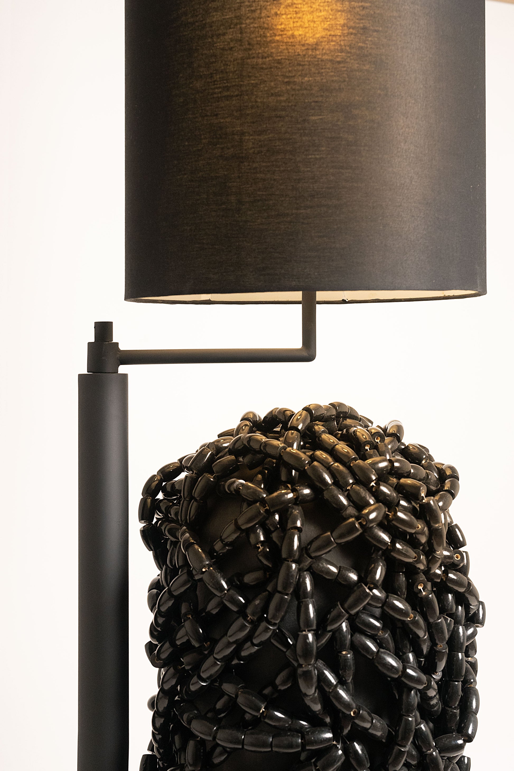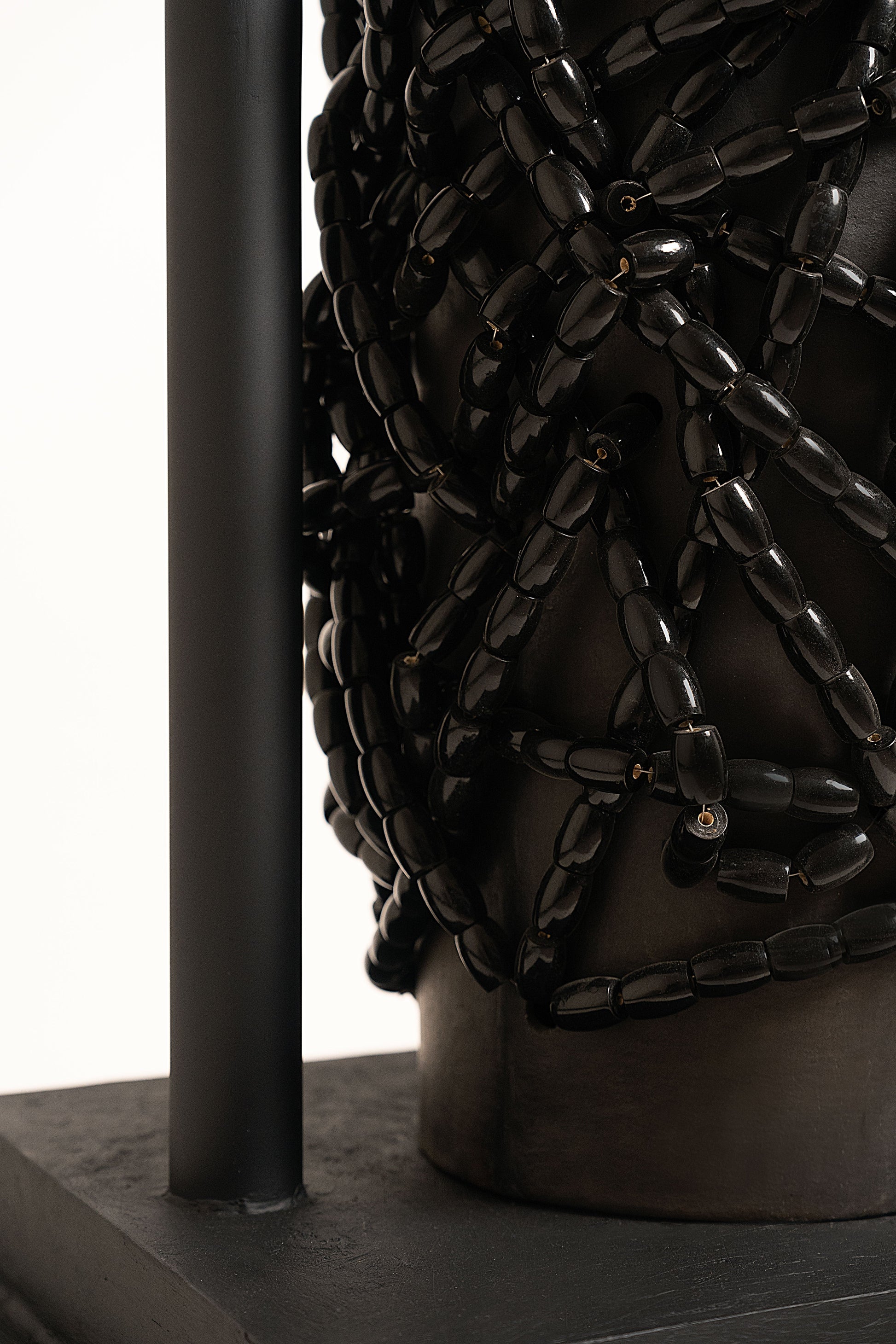 The Longpi Lamp is a monumental creation, a testament to the artistry and innovation of traditional Indian craftsmanship. Its base, the largest Longpi piece ever crafted at the Atelier, was rediscovered after years in storage—initially conceived as a prototype during a study of the craft. Reimagined with intricate weaving, the lamp features handwoven channapatna beads meticulously threaded through its many perforations, creating a striking, organic pattern. The design evokes the braided headgear of Naga sadhus, exuding an almost anthropomorphic presence, steeped in cultural symbolism. Towering and bold, the Lamp is not just a light source but a sculptural homage to India’s iconic forms and spiritual heritage.