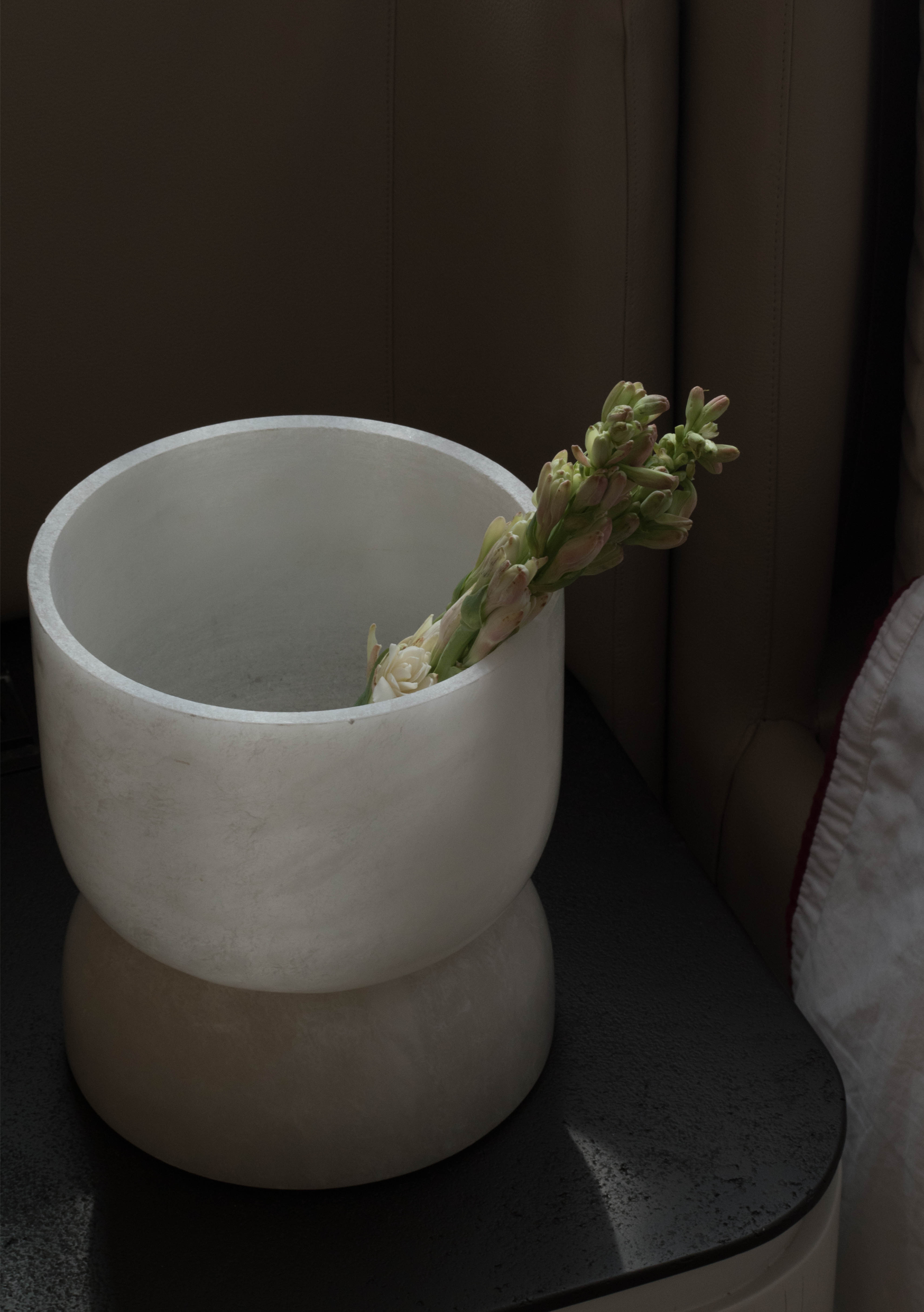 Illuminating the natural alabaster stone from within, the monoform makes for a perfect candle holder through simple form and impeccable detail. The contemporary design and handmade processes illustrates the foundational philosophy of the atelier.
