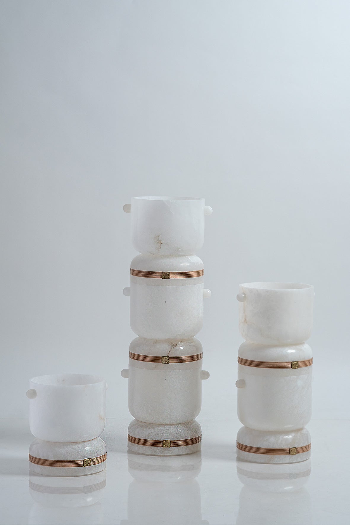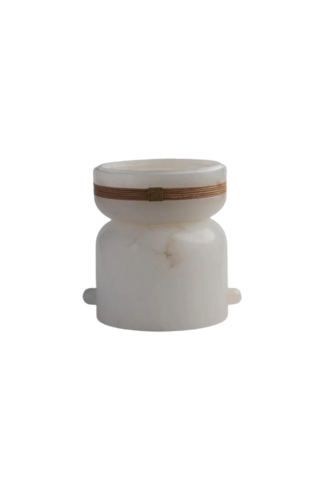 Gravitating towards the geometry of an ellipse, the cosmic egg marries repetition through a stackable, perfectly-grained, hand-carved object in Alabaster detailed with leather cords. Sculptural in form and purposeful to use, the piece has dual functionality, a simple rotation can make these design objects perfect candle holders, illuminating the natural stone from within. The organic soy wax used is naturally scented from lavender and mint essential oils. The contemporary design and handmade processes illustrate the foundational philosophy of the Atelier.