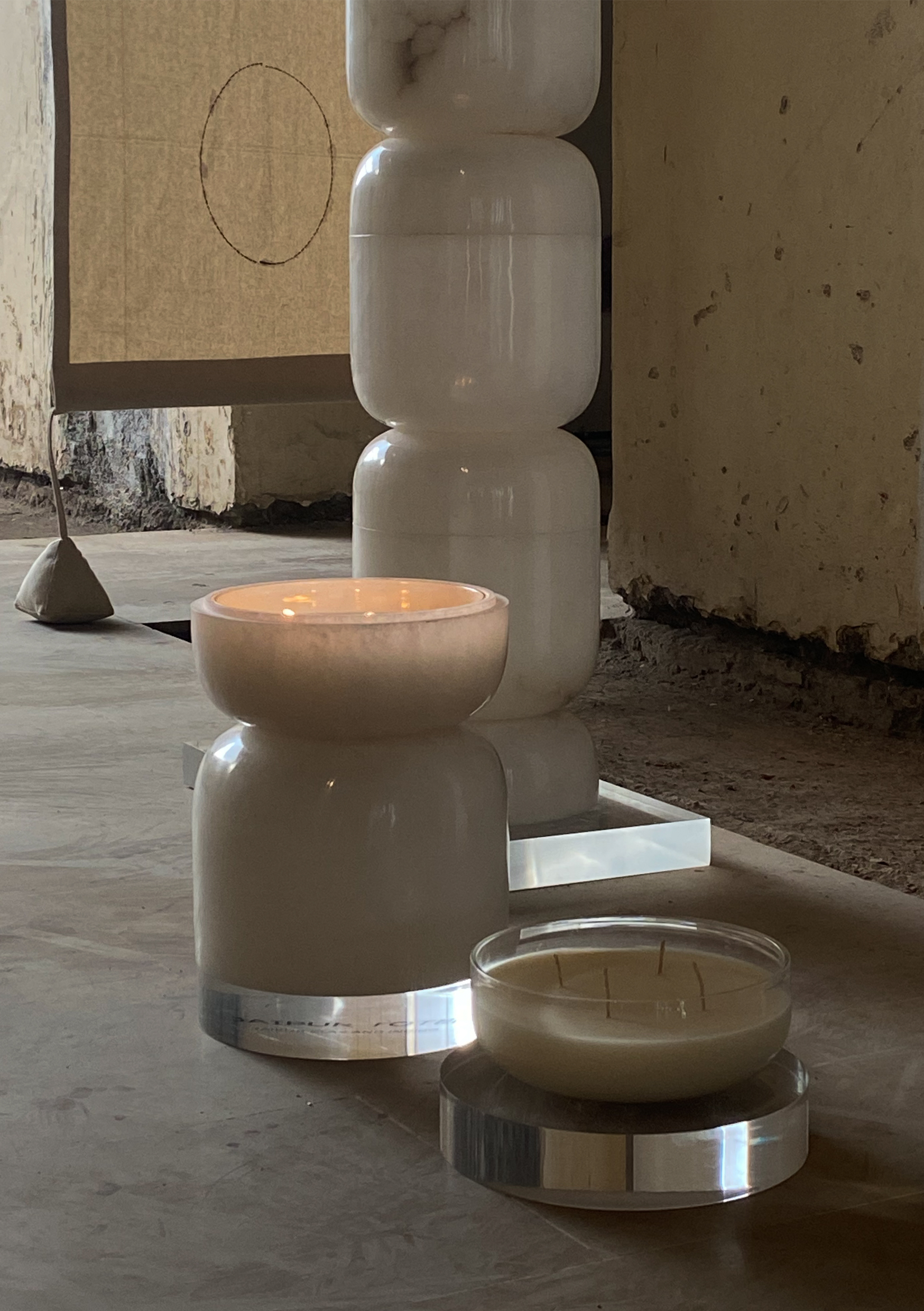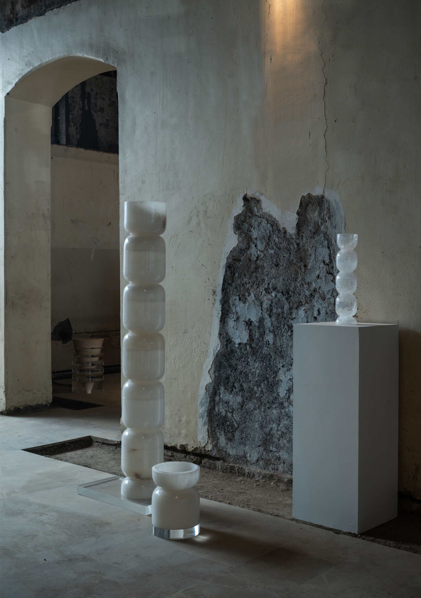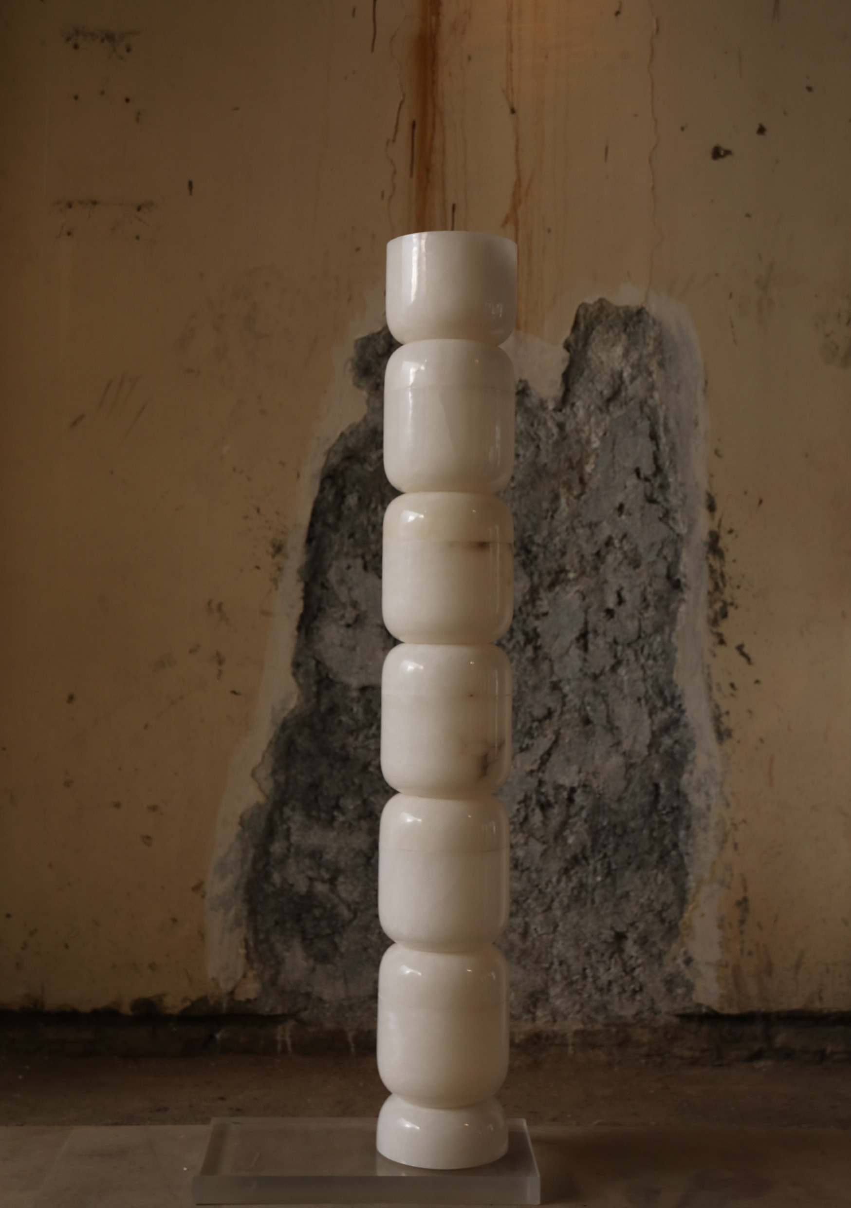 Gravitating towards the geometry of an ellipse, a cosmic egg like form marries repetition through a stackable, perfectly-grained, hand-carved piece of tableware in Alabaster. Sculptural in form and purposeful to use, the set of six bowls perfectly fit into one another to create a delicate totem in white.