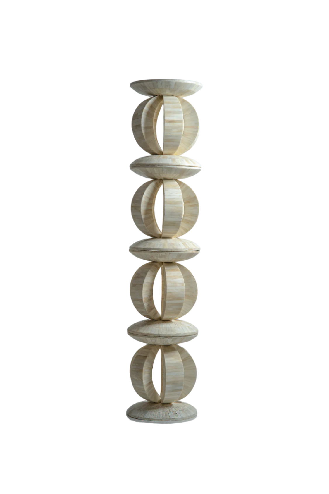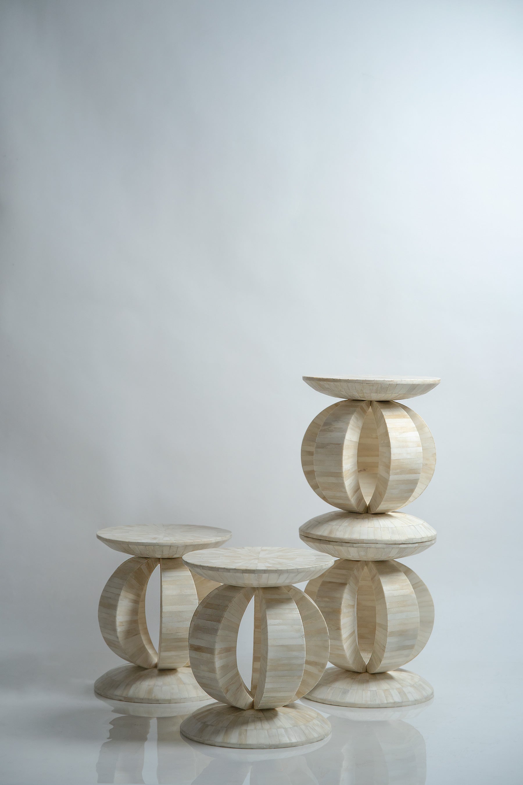 Reminiscent of a deconstructed sphere, the bone pillar with its curved profile demonstrates impeccable craftsmanship with its raw texture. A marriage of primordial Indian handicrafts with a modern-day aesthetic, this sculpture fragments itself into three perch stools with sculpted crescent-like forms connecting two discs - a play of form and proportion.