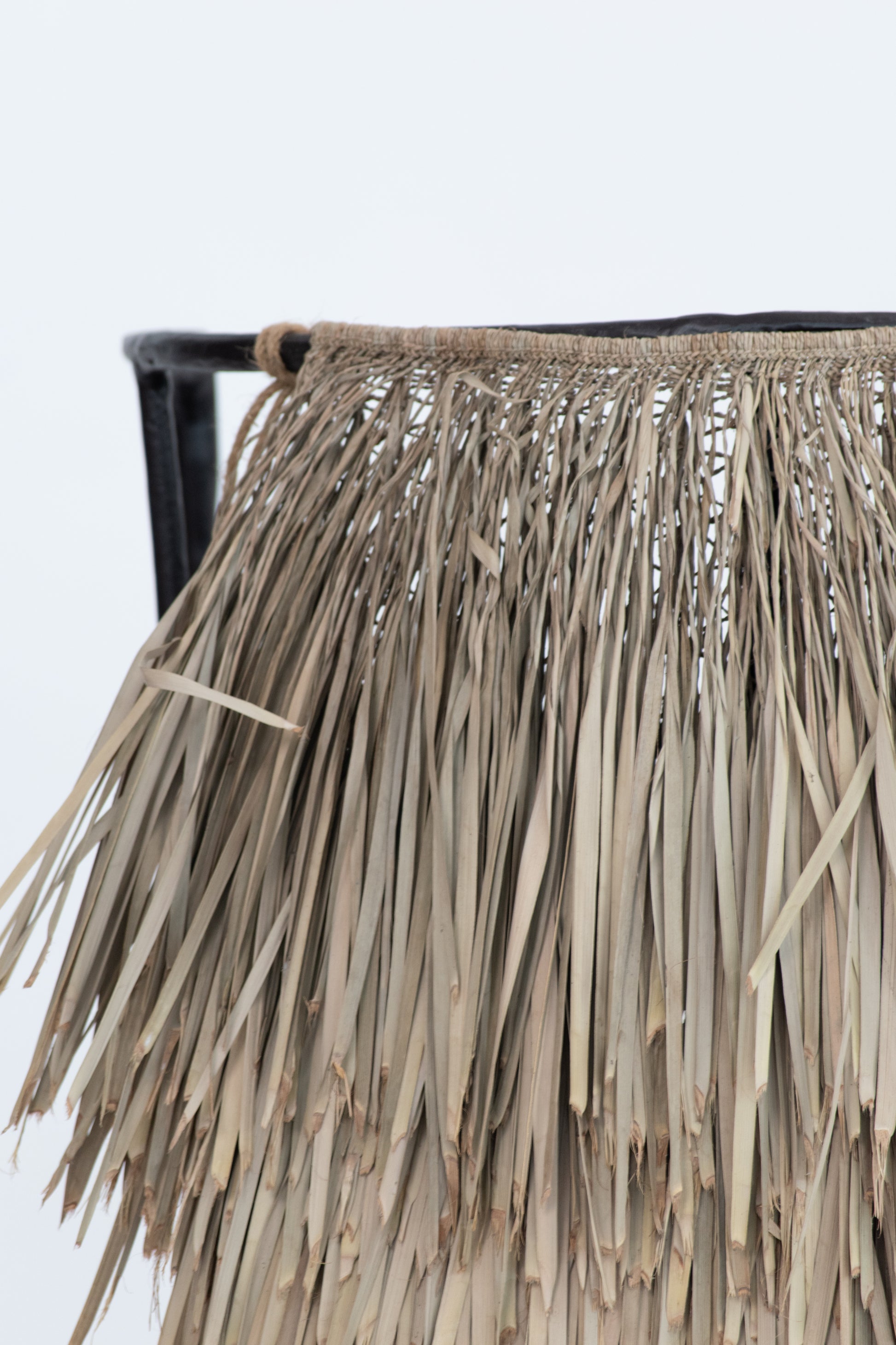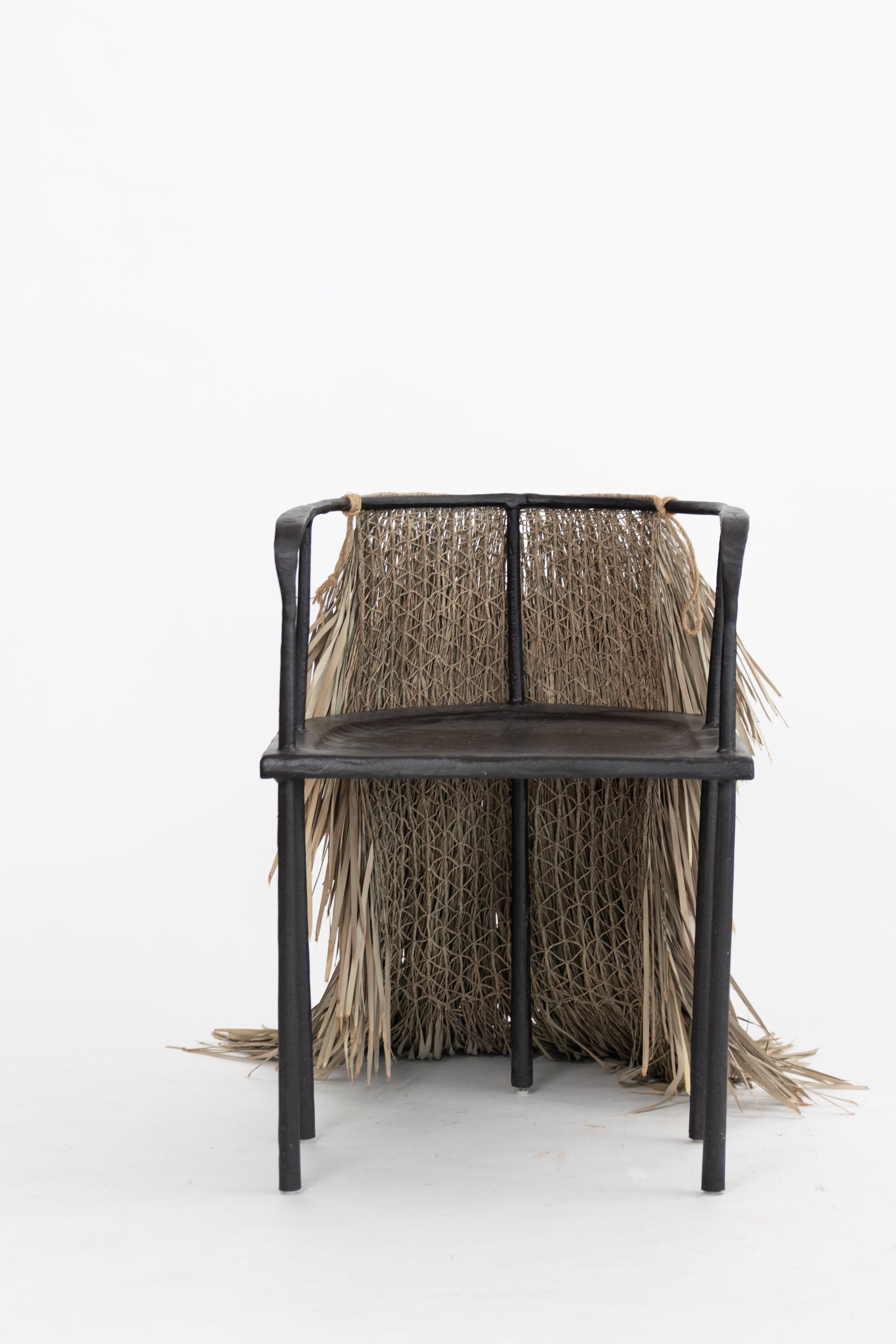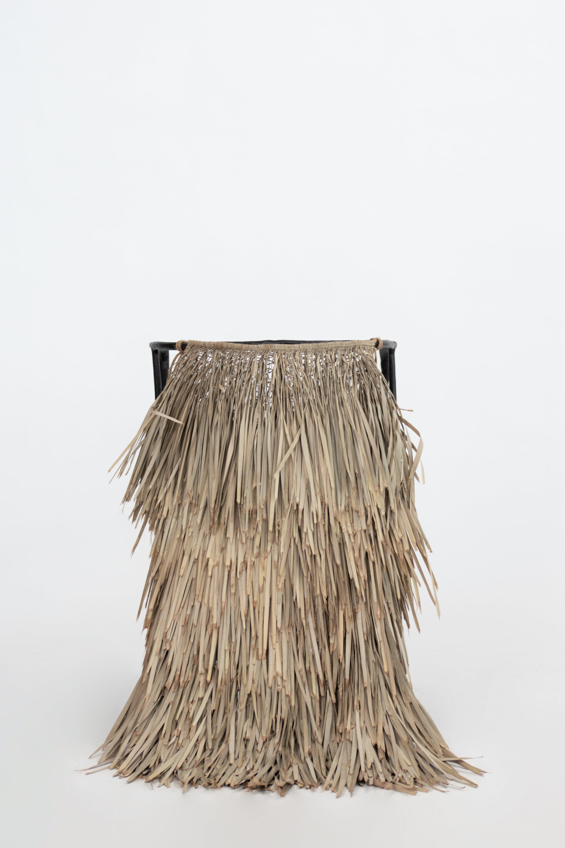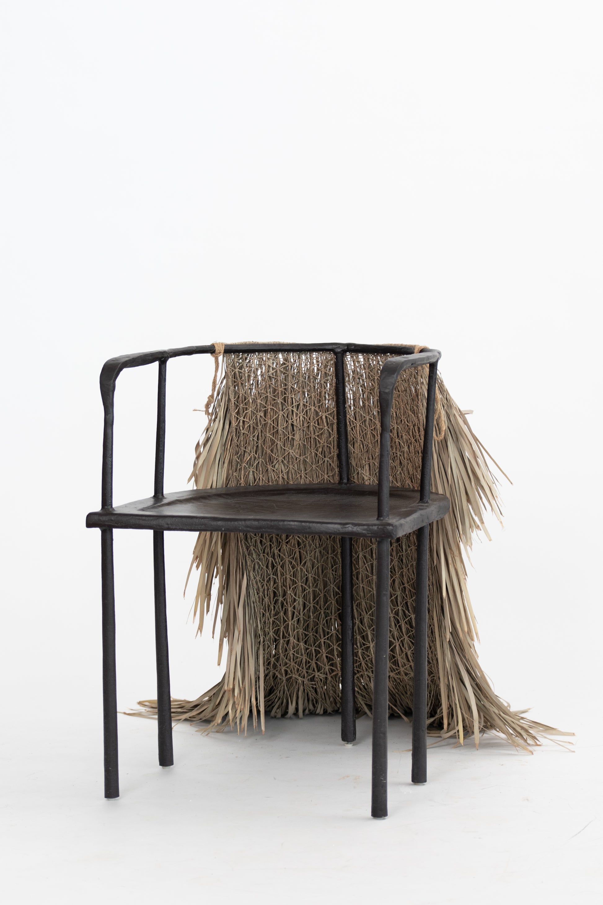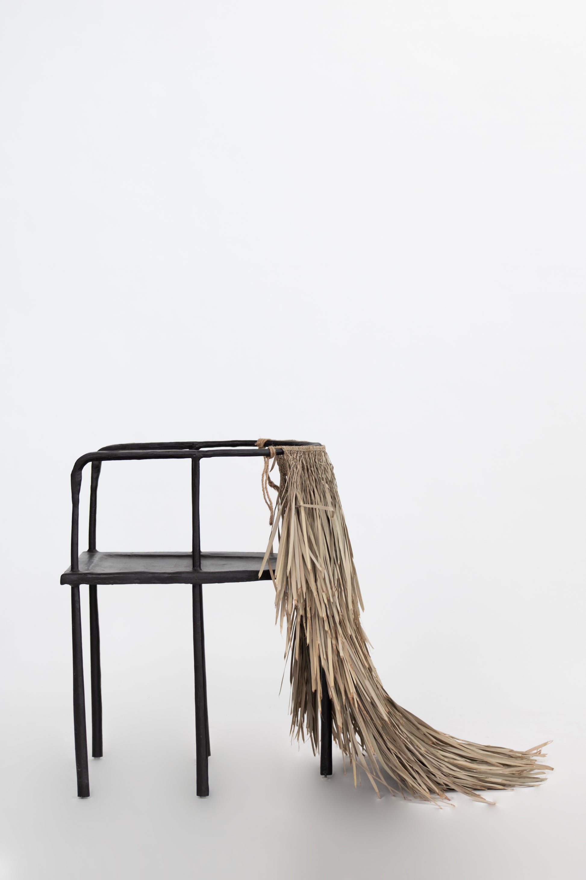 A fi ve-legged calculatedly designed frame stands fragile, cast in aluminium and fi nished in a dark bronze. The cold metal fi nds warmth with the addition of the ‘Naga raincoat,’ giving the piece its identity - the traditional raincoat, woven using elephant grass has an overwhelming presence on the chair, further enhancing a brutalist tribal characteristic.