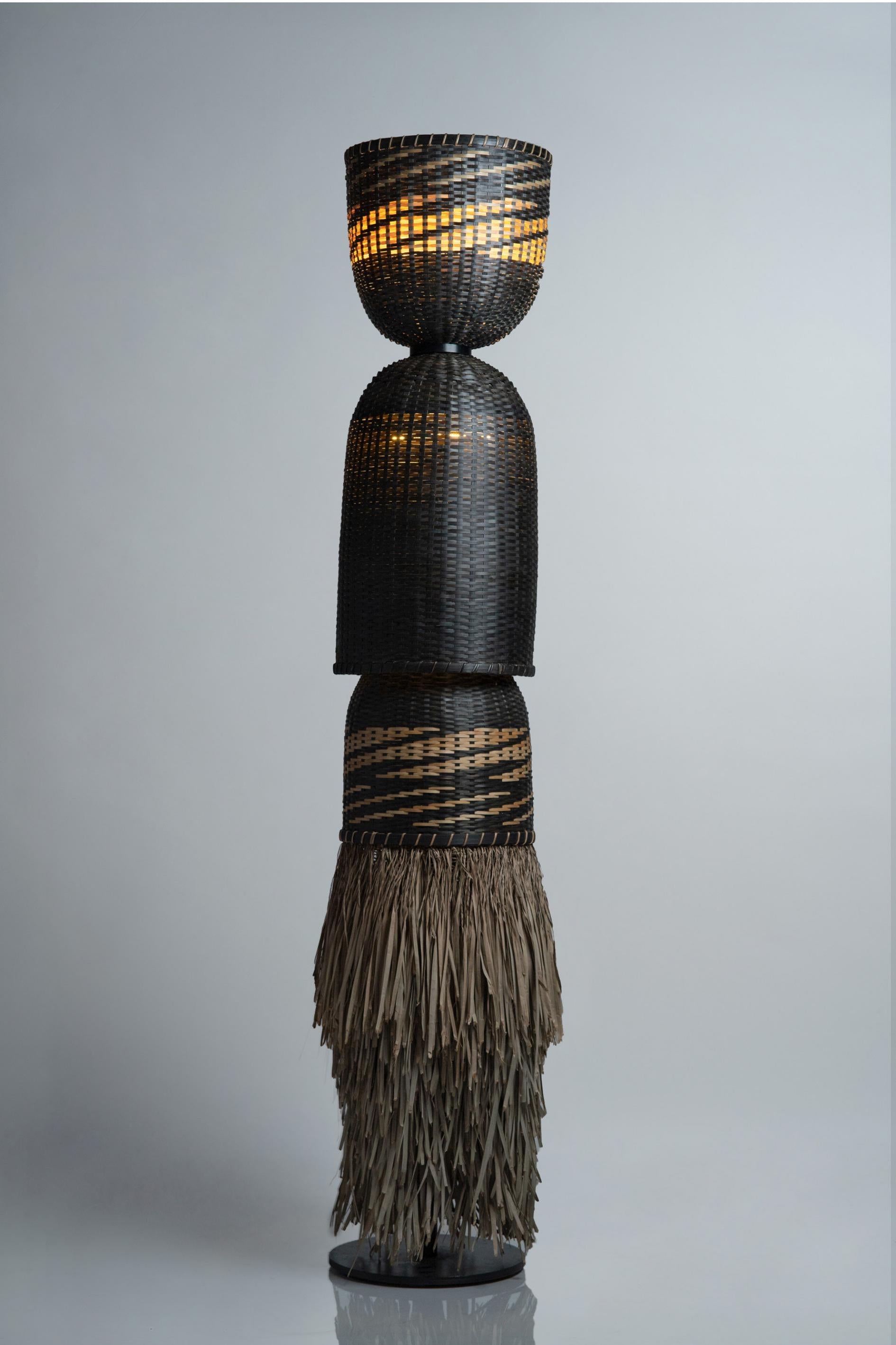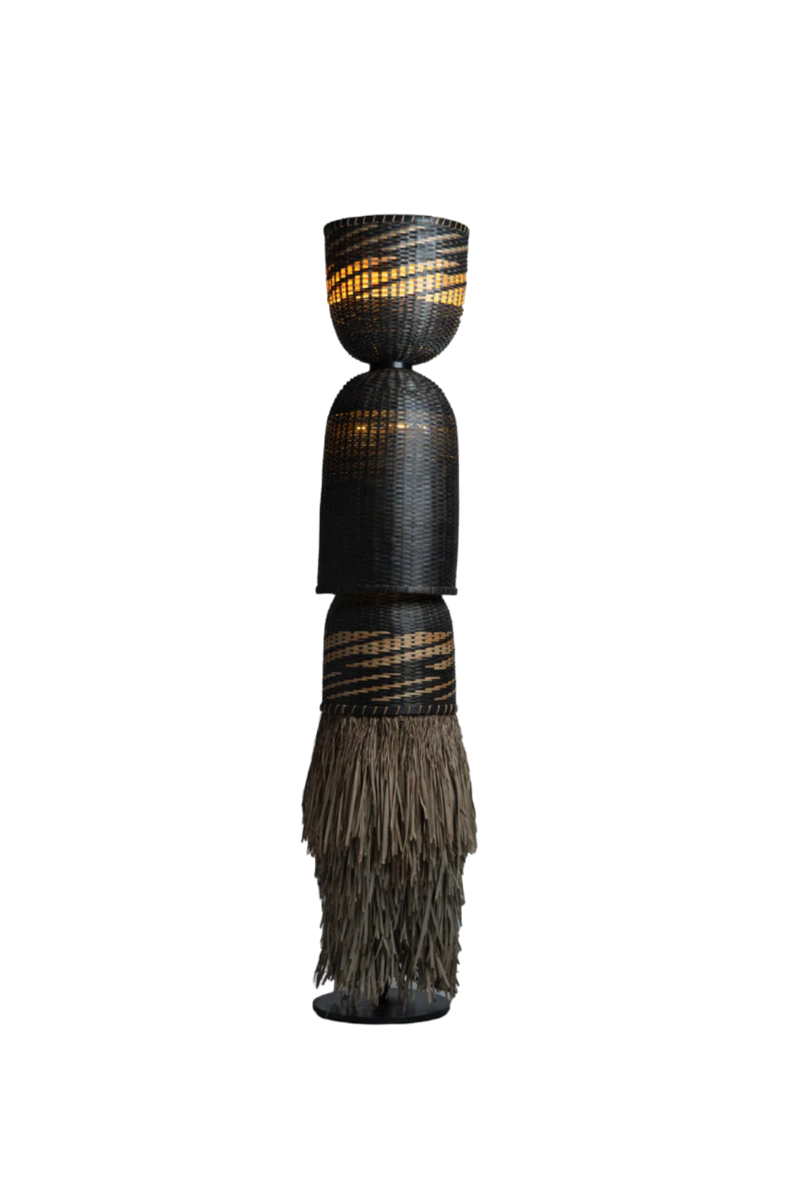 The Naga Raincoat Pillar incorporates the ‘Enhyie,’ a weather-protective shield using natural fibres, locally used and produced in the Dimapur District of Nagaland. The length incorporates a floor-standing lampshade and two sets of baskets distinctive of the intrinsically woven patterns in cane, an exploration of a ‘brutalist tribal’ character, celebrating dynamism.