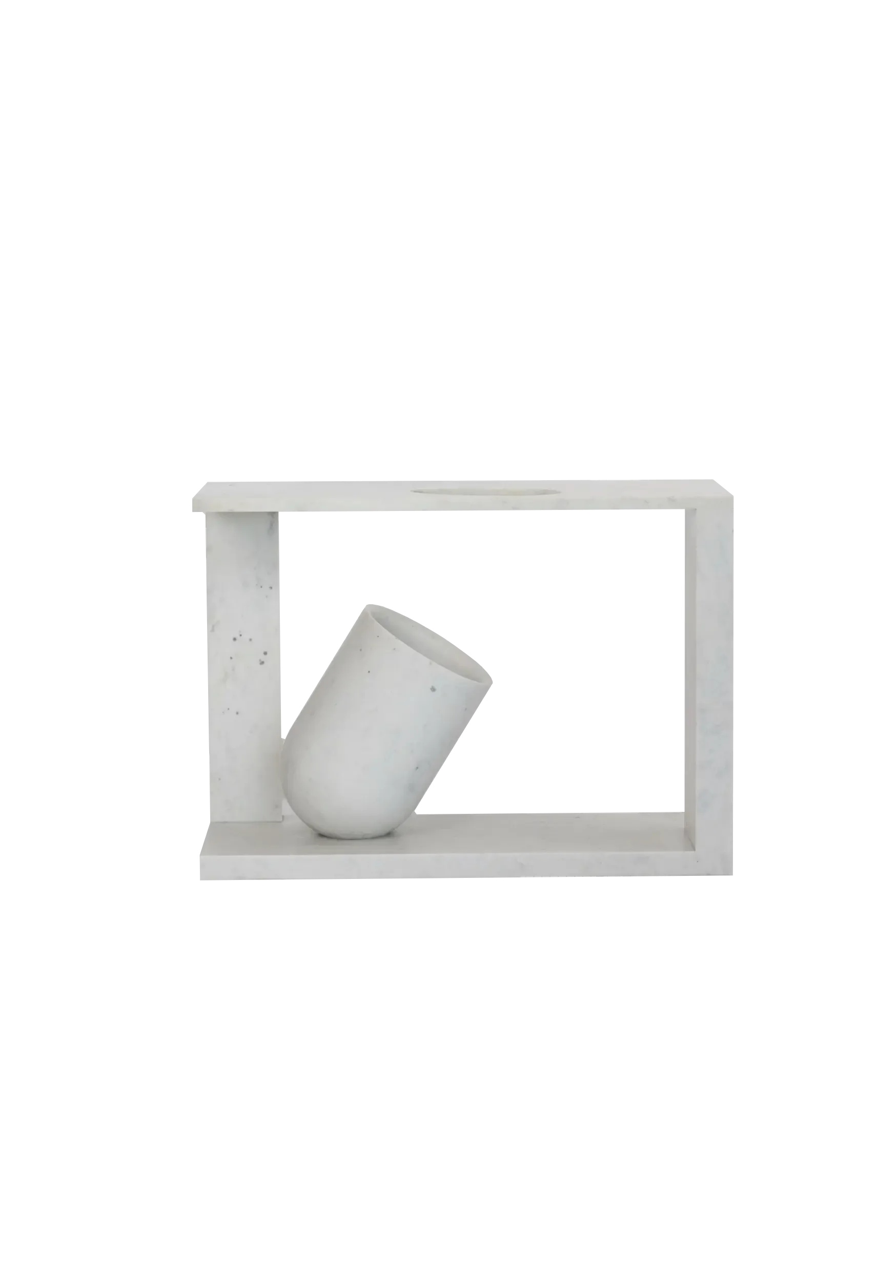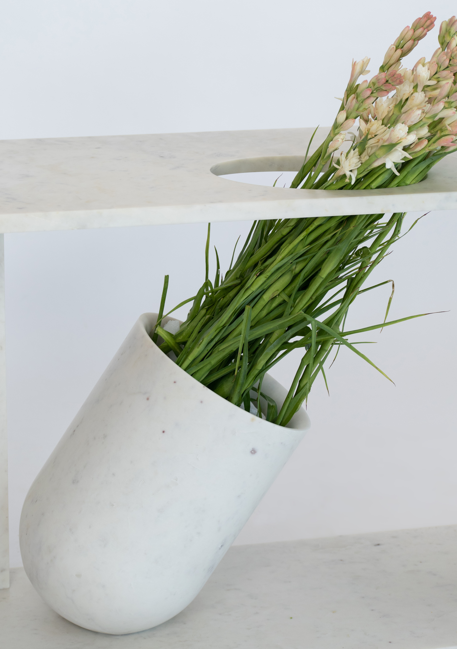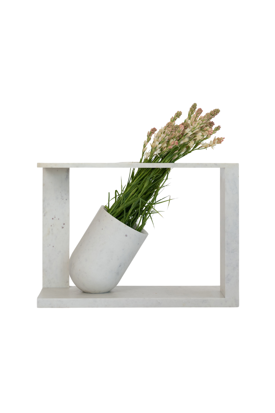 An angled cosmic egg is calculatedly placed within a rectangular frame in a white quarry - the cuboid is punctured at the surface to account for an addition of a planter from within - the object is functional yet interactive, playful yet durable.