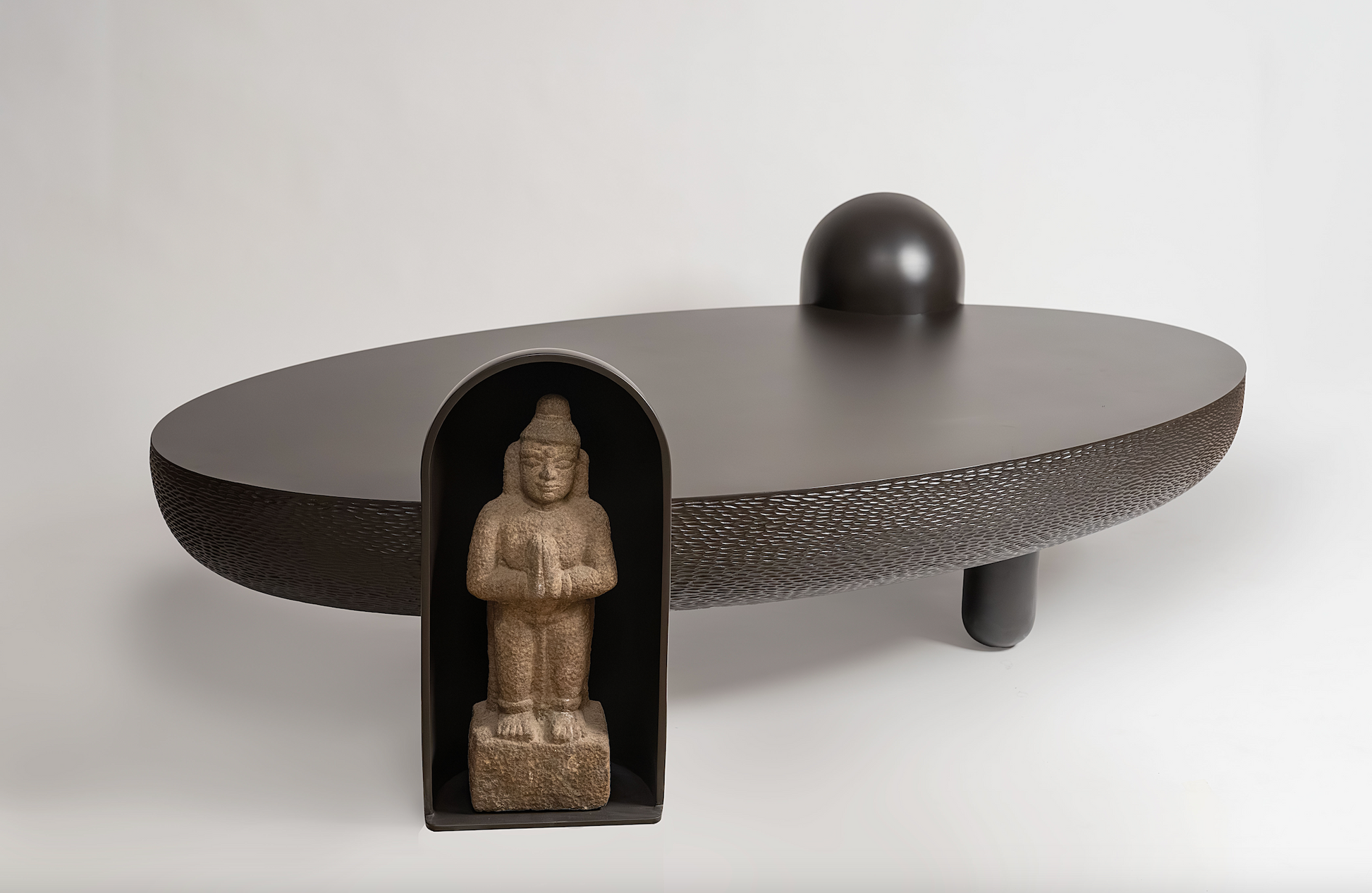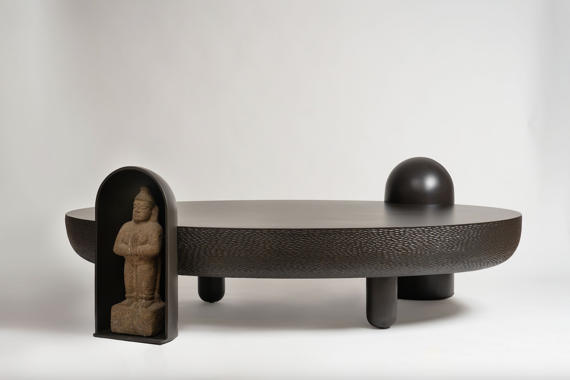 The Pranam Coffee Table is a harmonious blend of functionality and artistry, designed to serve as both a coffee table and a bench. This iteration elevates its predecessor with a dual-piece composition, offering a captivating 360-degree presence. Its floating form is anchored by translucent resin legs, creating an ethereal balance, while the scooped wooden surface features a lustrous bronze finish, exuding timeless elegance. Seamlessly versatile and sculptural, the Pranam Coffee Table transforms any space into a sanctuary of design and purpose.