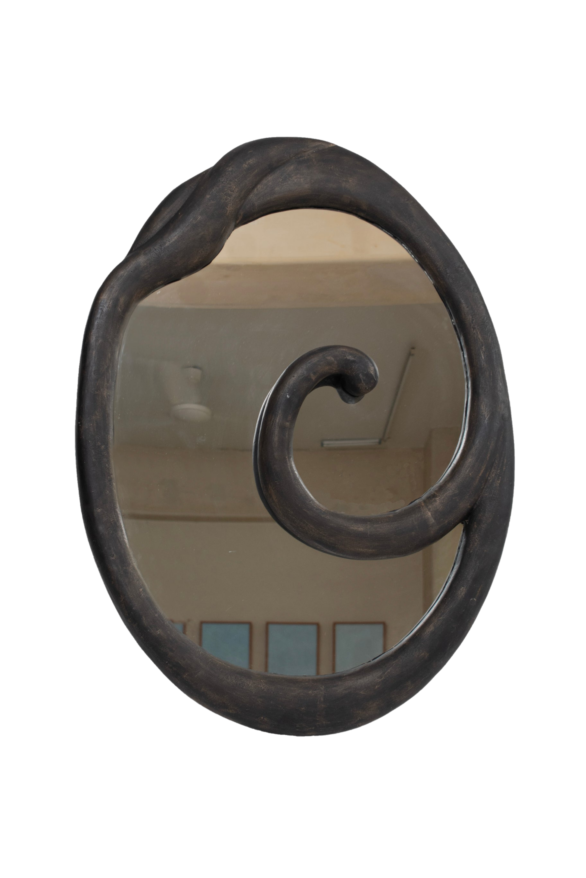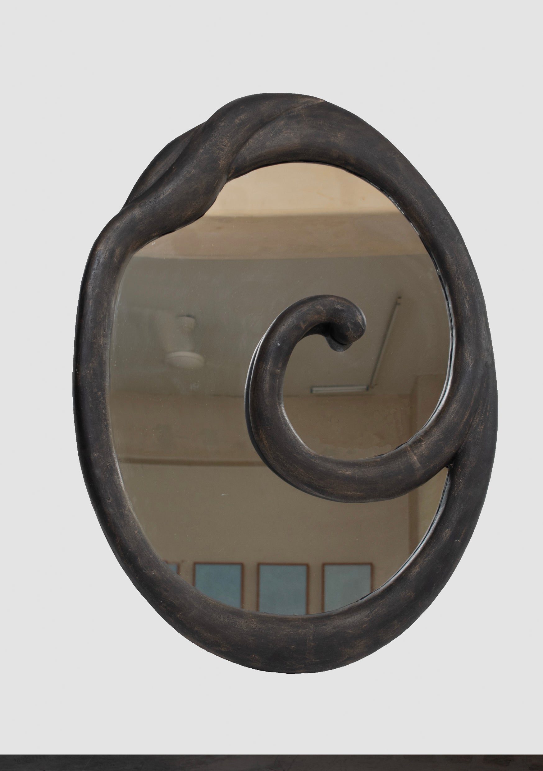 The ‘Axis Mundi’ symbolises the intersection of the heavens and earth, rooted with a fixed point; the pattern is continuous, going back and forth. The mirror mimics this representation through its form - emerging from and going into the reflective surface, the object is a visual illusion, a play of perspective.