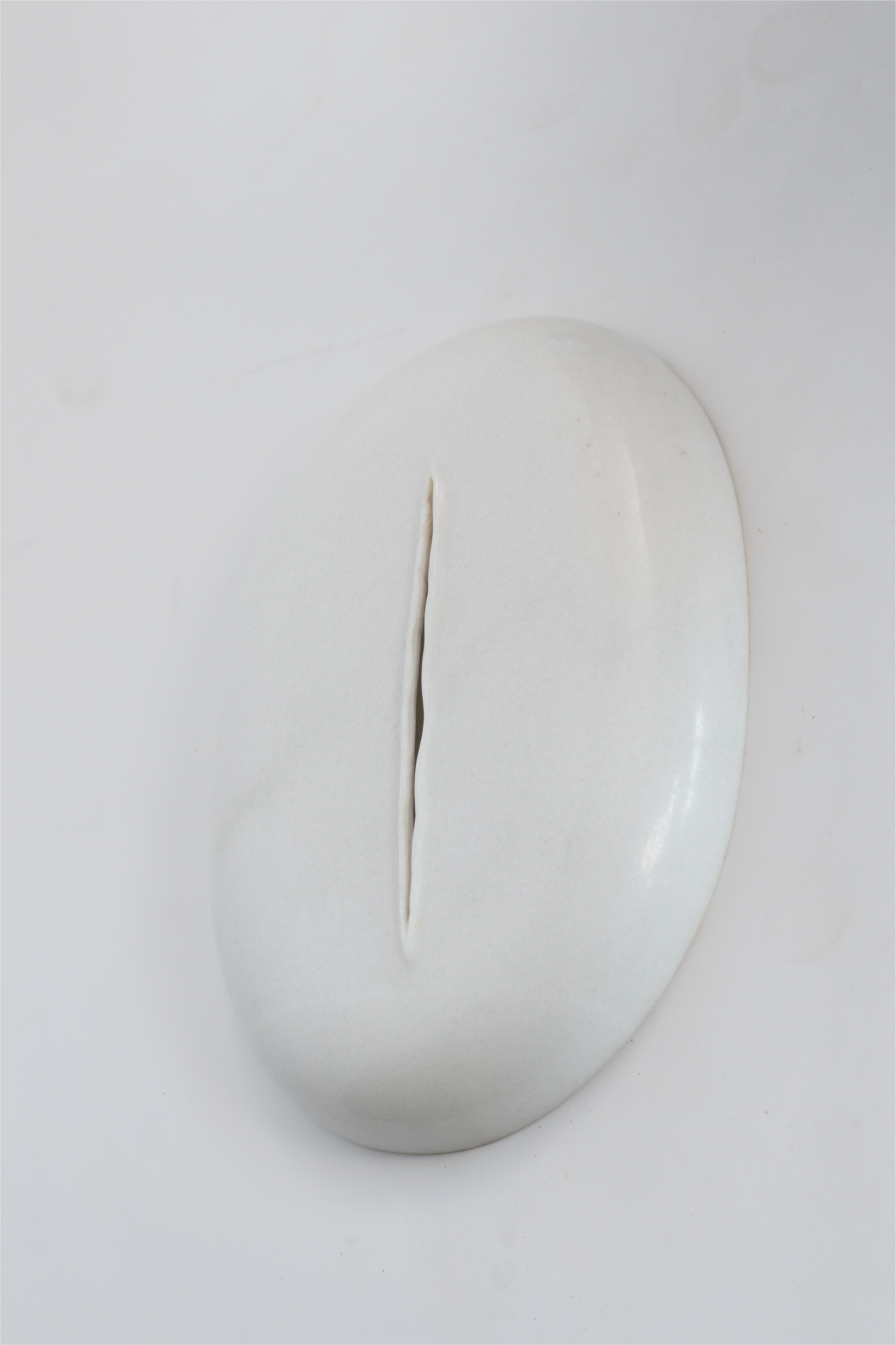 A carefully carved wall sconce in marble, that redefi nes hand crafted perfection at its best - inspired by the renowned Lucio Fontana, and his impeccable hand skill, the sconce shines brightly through a deep incision, calculated in form, finish, character and texture - the ellipse emits a radiant warm yellow glow.