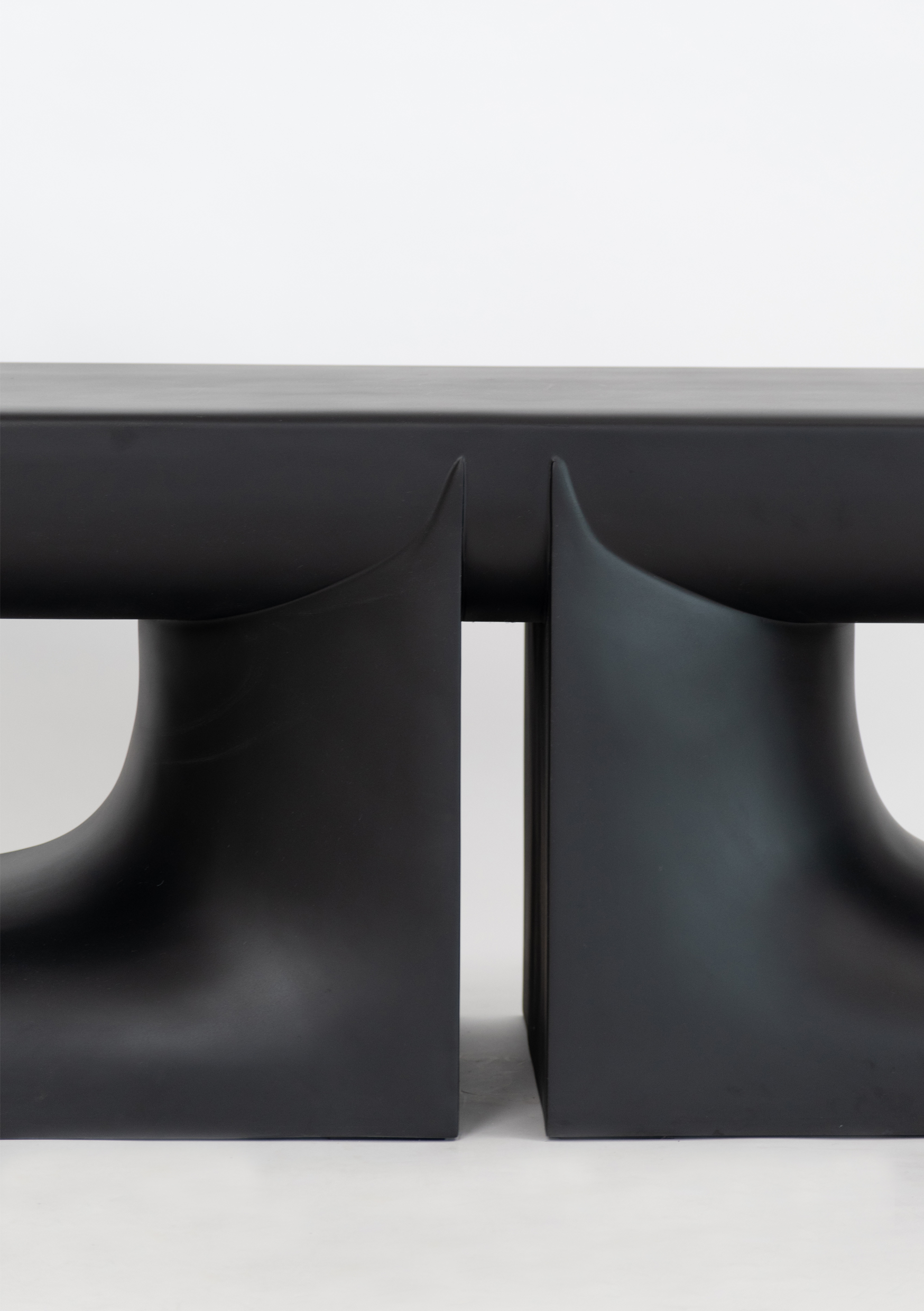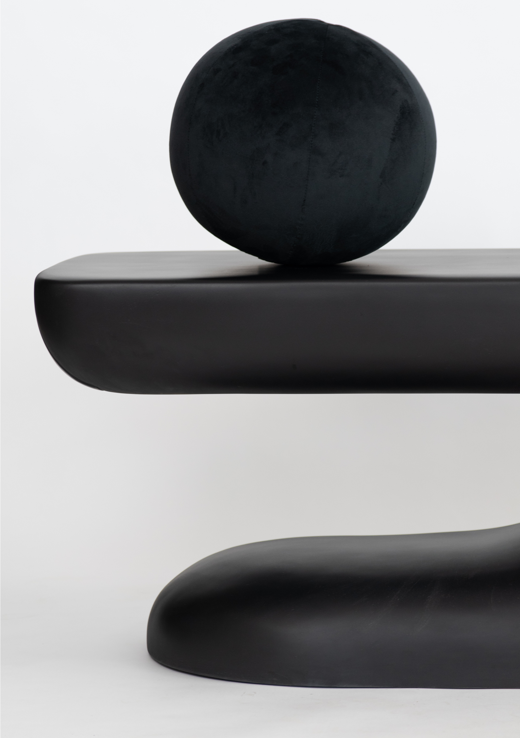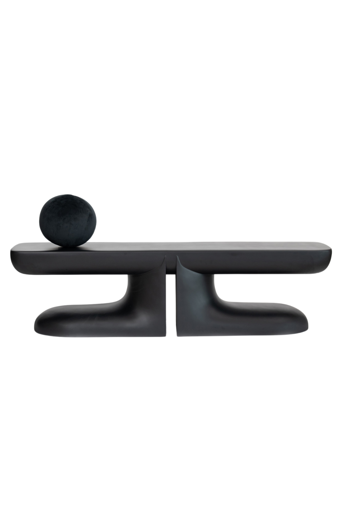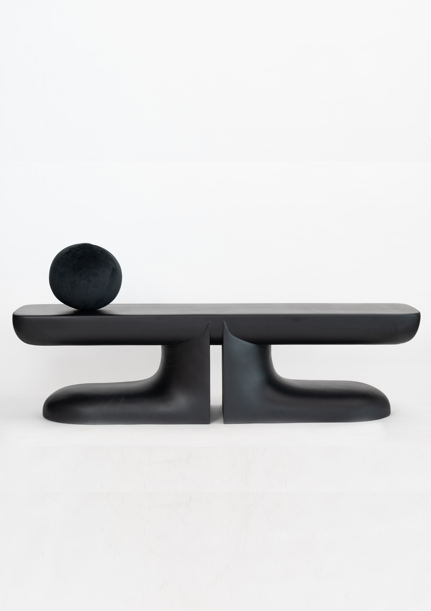 A play of proportions, this bench made in FRP coated in black showcases geometric forms and curvilinear outlines while adhering to Shah’s Wabi-Sabi aesthetic. This functional sculpture, symmetrical in stature, with legs protruding out has a strong presence. Accompanied with a soft orb cushion and accessible from every corner, truly an epitome of extravagance.
