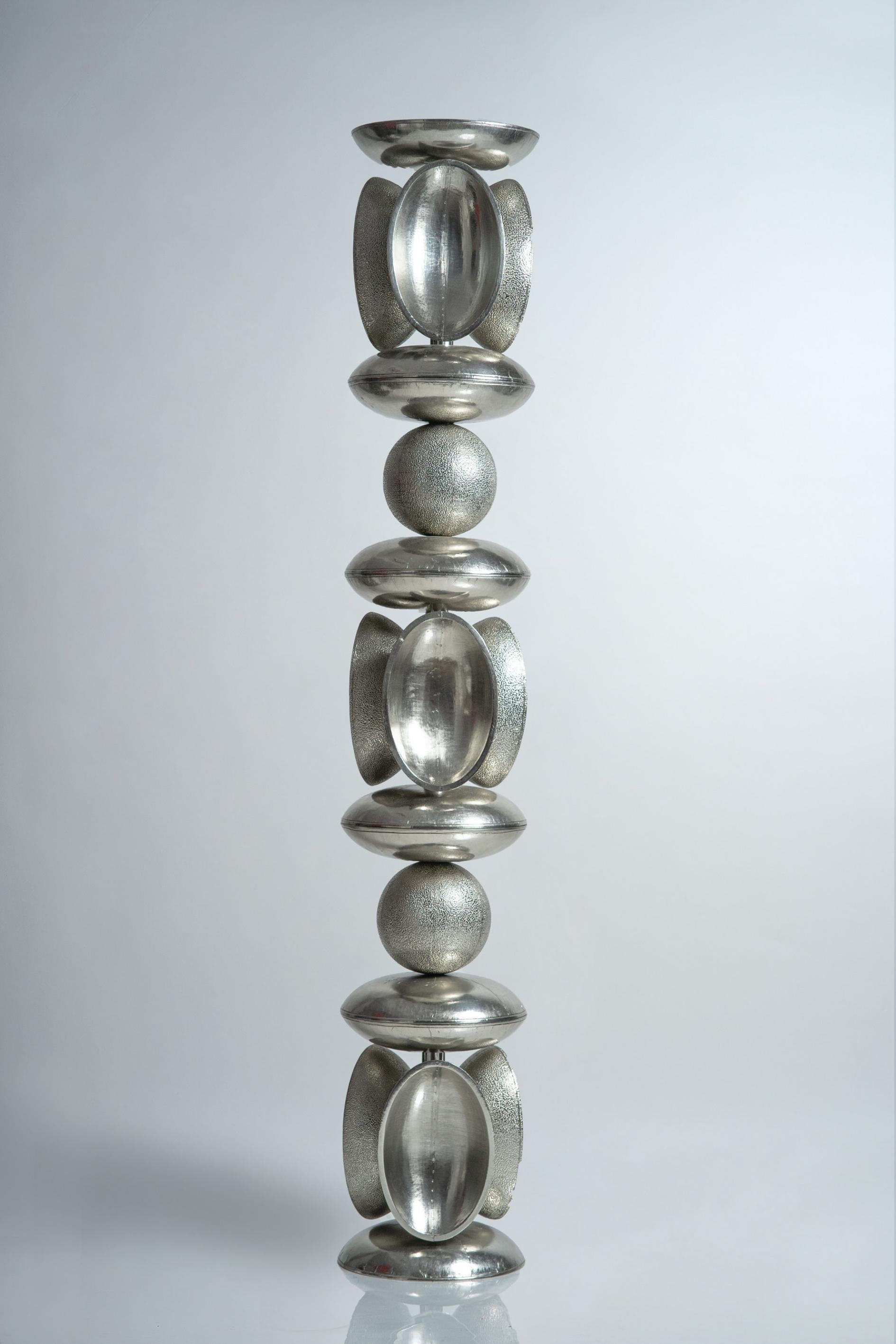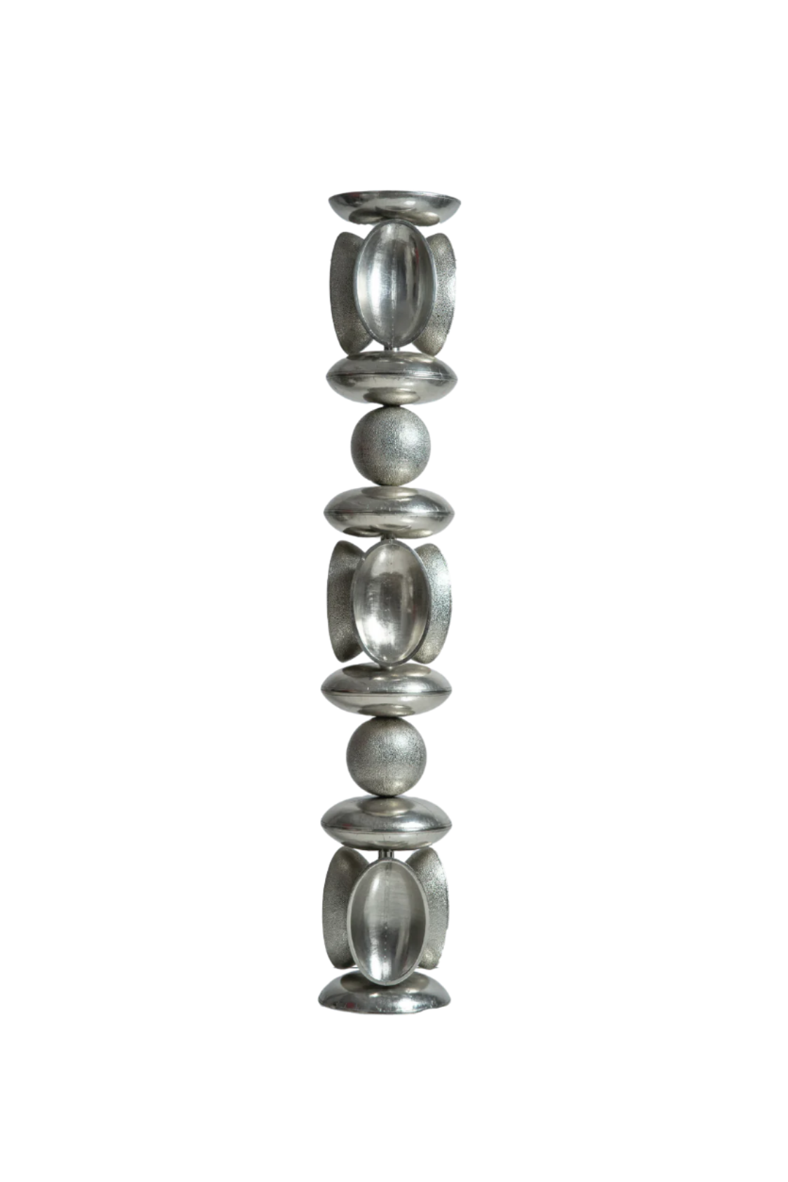 Gravitating towards the geometry of an ellipse, the cosmic egg like forms marry repetition through a stackable series of stools hand-textured to perfection. Disassembling into a set of five stools - an amalgamation of unevenly textured spherical and elliptical cores in contrast with its smoother even ends, this pillar exemplifies fine Rajasthani craftsmanship.